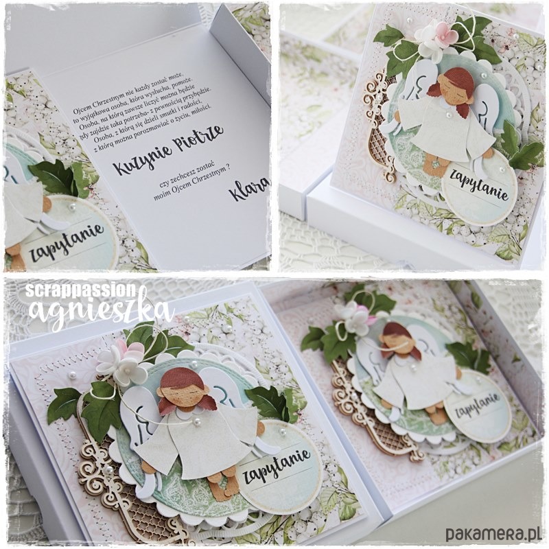 Komplet 2 kartek w pudełkach (Prośba o zostanie Rodzicem Chrzestnym. Ciociu czy zostaniesz moją Matką Chrzestną? Wujku czy zostaniesz moim Ojcem chrzestnym?). Kartki wykonana recznie z materiałów najwyższej jakości. Ozdobę stanowią liczne elementy dekoracyjne, przeszycia maszynowe. W komplecie pudełko z okienkiem. Całość zabezpieczona transparentnym opakowaniem WZÓR polecam :)