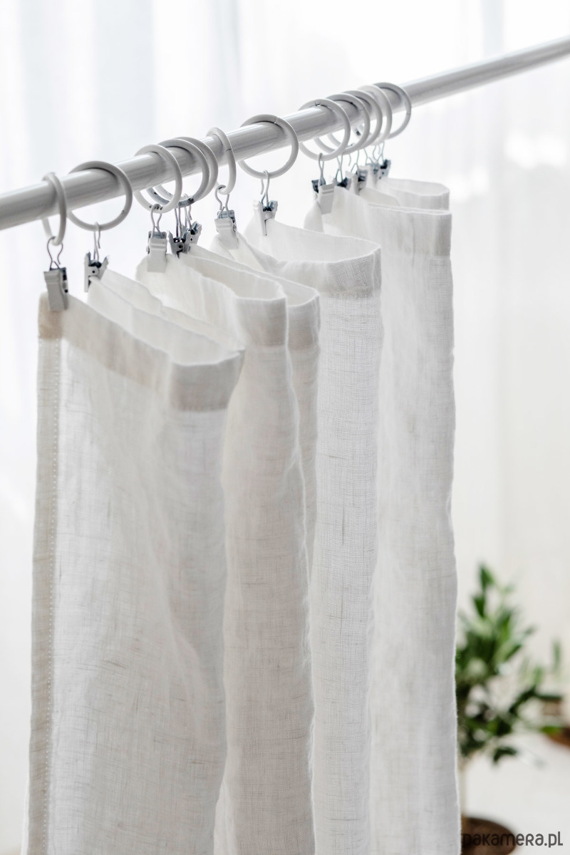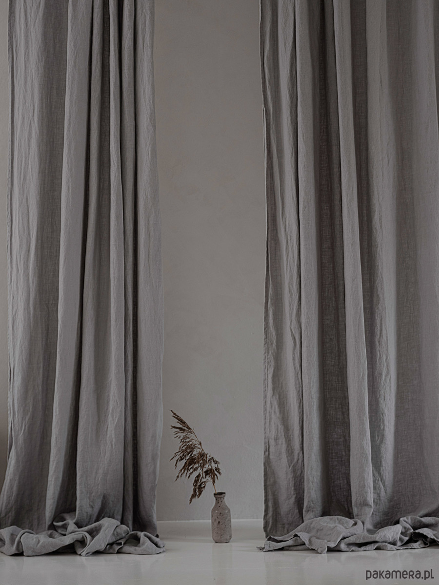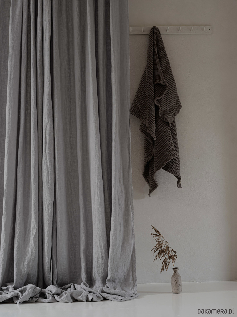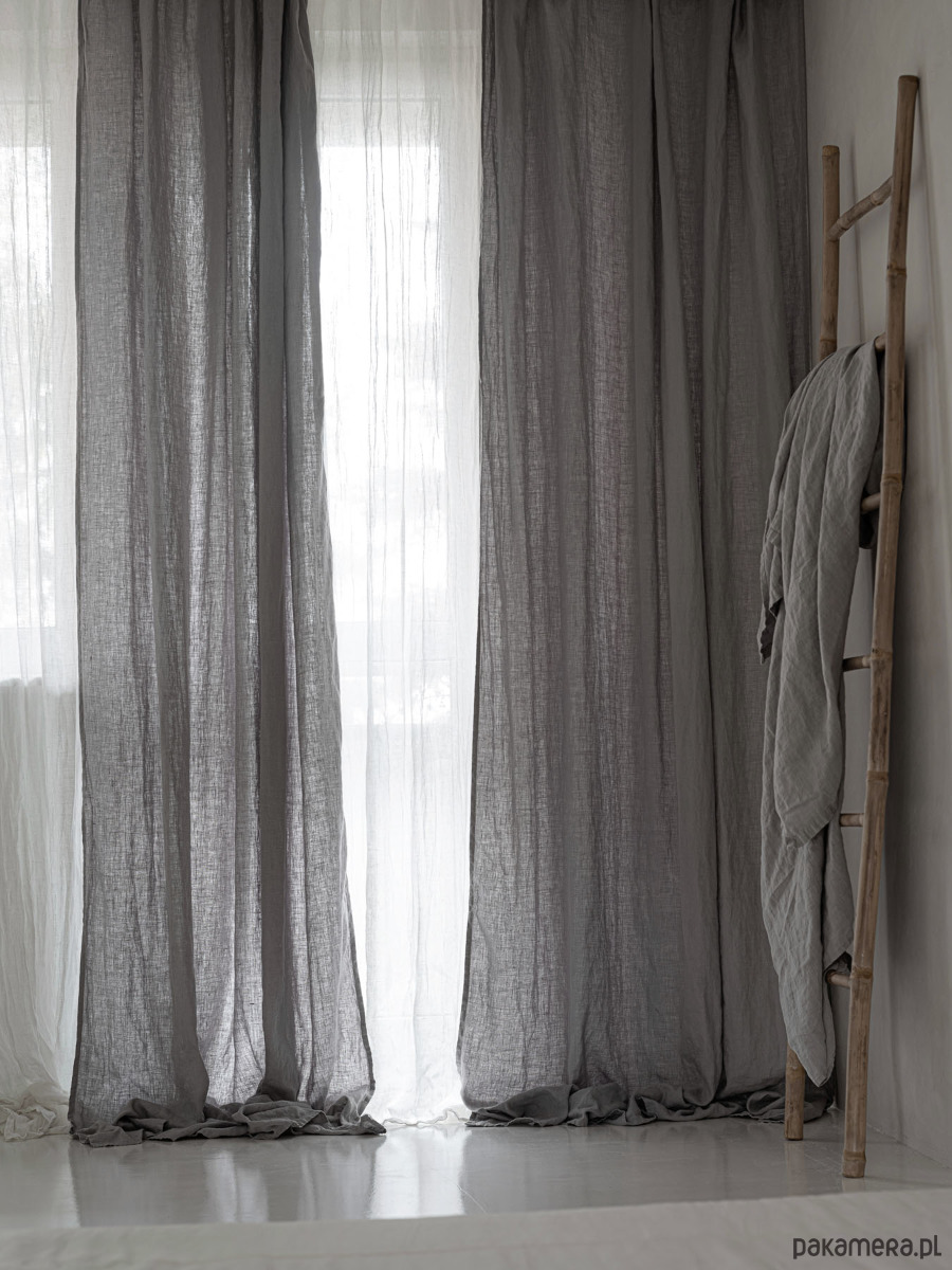 Zasłona wykonana została ze średniej grubości (185g) lnianej tkaniny, która nie blokuje całkowicie światła ale zapewnia wystarczającą intymność.