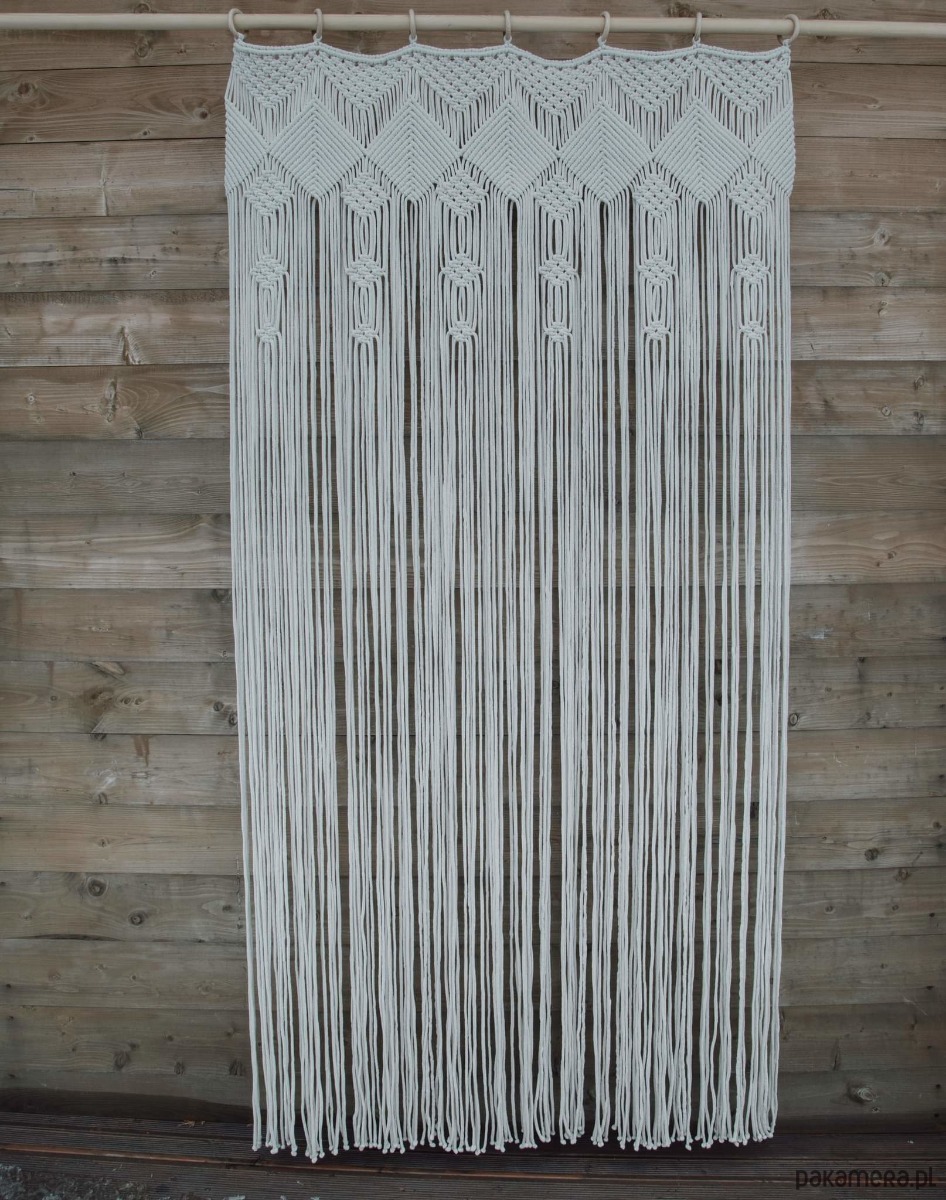 Makrama może służyć jako zasłonka drzwi lub wnęki.. do zasłonięcia przejścia do garderoby lub innego pomieszczenia..przez co pełni funkcje praktyczna i ładnie to wygląda Wykonana ze sznurka bawełnianego w kolorze beżowym .. Wymiary szerokość około 100 cm i długa na około 207 cm.(+/-) . zasłonka jest na drewnianych kołach przez co łatwo można przesuwać na drążku.. DOSTĘPNA od ręki!!!