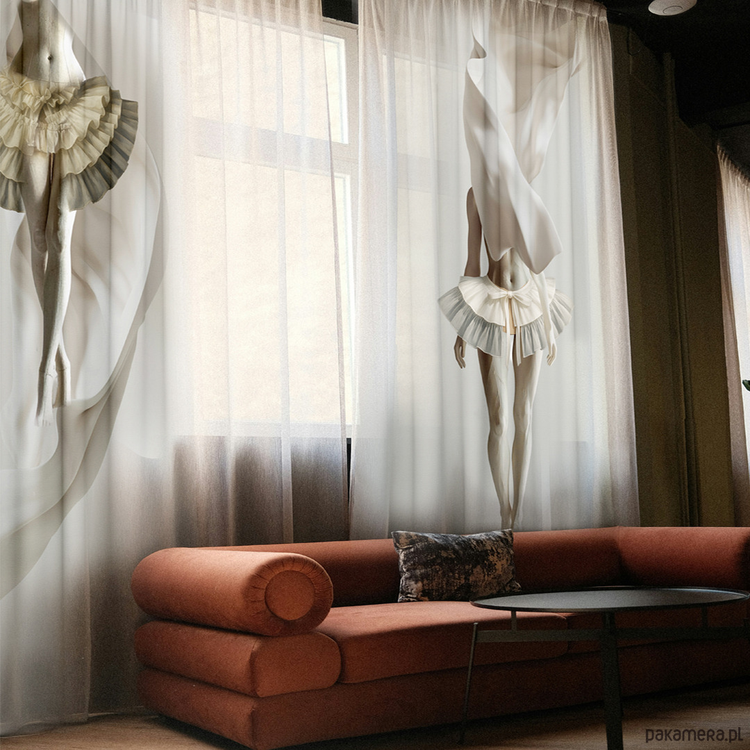 Zasłony „Duet” to połączenie delikatności tkaniny i siły artystycznej formy. Inspirowane ruchem, tańcem i teatralnym gestem, wprowadzają do wnętrza poczucie lekkości i harmonii. Falująca tkanina i subtelne przejścia barw – od złamanej bieli po głębsze, przydymione odcienie – tworzą wyjątkową kompozycję, która działa jak obraz na ścianie.
