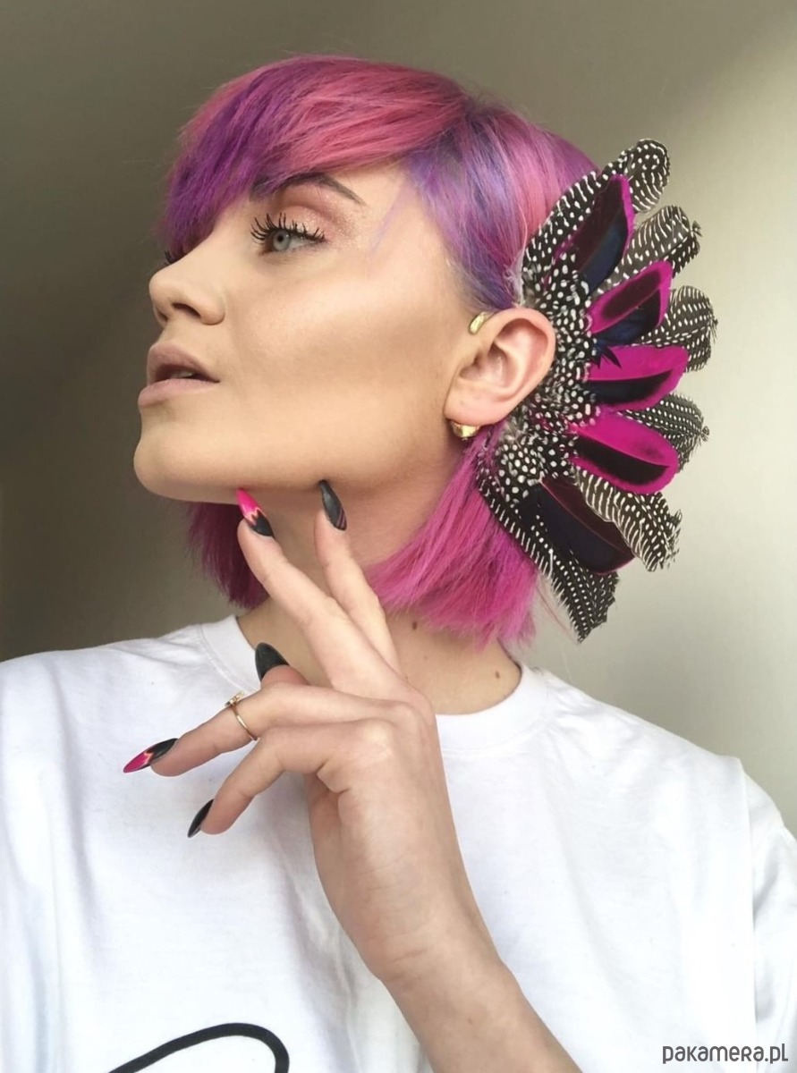 Zausznica została wykonana ze spektakularnych czarno-białych lotek perliczki i kolorowych bocznych piór kaczych . Baza wkładana za ucho wykonana jest z metalu. Zausznica jest niebanalnym dodatkiem dla wszystkich miłośników mody i odważnego stylu. Może być uzupełnieniem stroju na imprezę, festiwal, do sesji zdjęciowej, na scenę. Dla odważnych i lubiących bawić się modą.