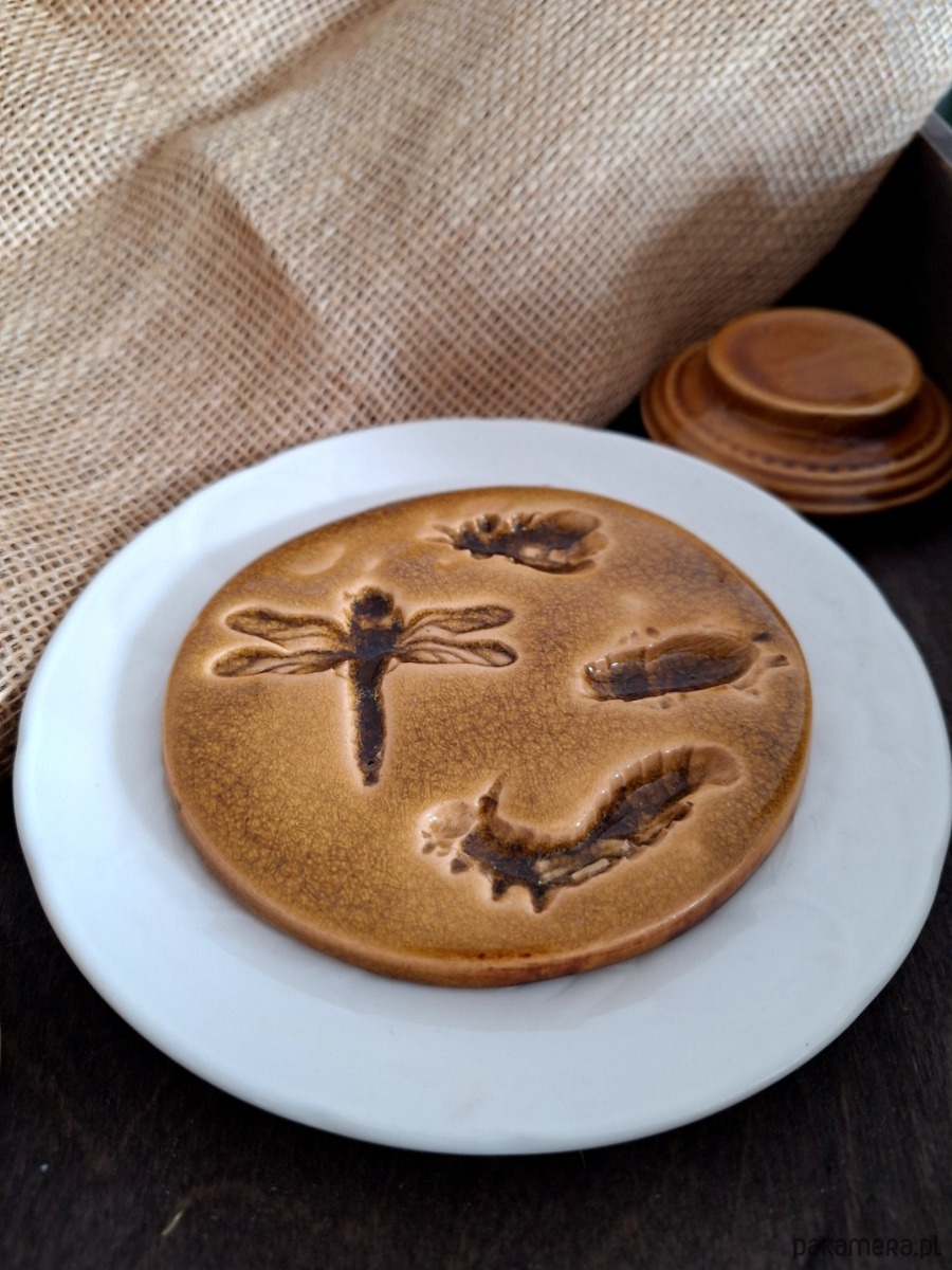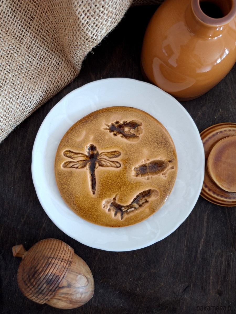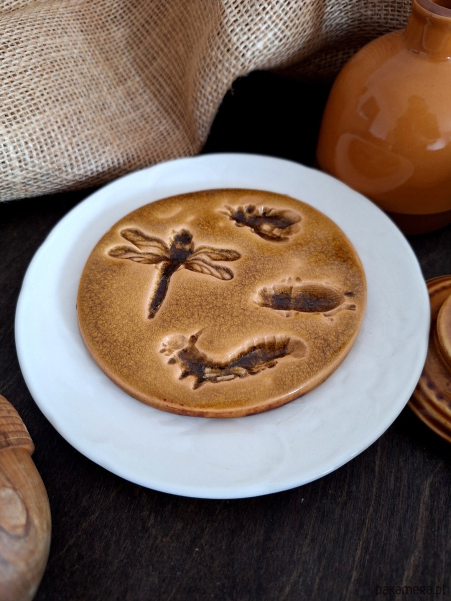 Ceramiczna okrągła zawieszka z motywem zwierzęcym / owady. Dekoracja posłużyć może jako wisior ścienny, ewentualnie podstawka. Z tyłu znajduje się metalowy haczyk umożliwiający zawieszenie dekoru na ścianie. Ręcznie wykonana ozdoba z wyżłobionymi kształtami owadów, szkliwiona głębokim bursztynowym kolorem. Wyjątkowa ozdoba o nietuzinkowym charakterze, dla miłośnika natury i owadów.