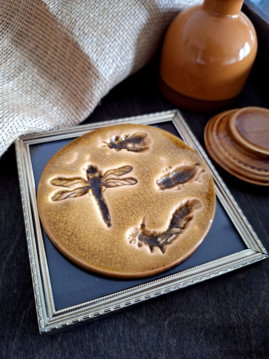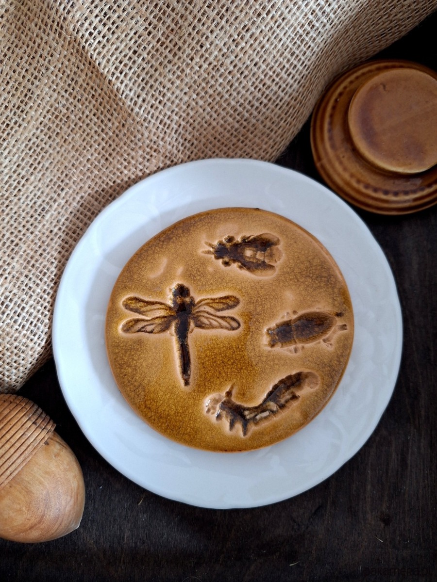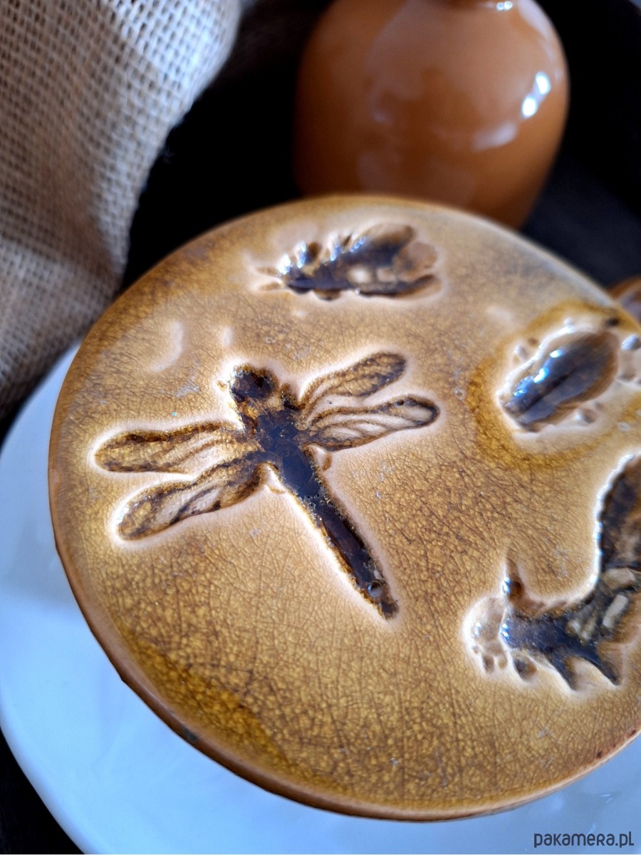 Ceramiczna okrągła zawieszka z motywem zwierzęcym / owady. Dekoracja posłużyć może jako wisior ścienny, ewentualnie podstawka. Z tyłu znajduje się metalowy haczyk umożliwiający zawieszenie dekoru na ścianie. Ręcznie wykonana ozdoba z wyżłobionymi kształtami owadów, szkliwiona głębokim bursztynowym kolorem. Wyjątkowa ozdoba o nietuzinkowym charakterze, dla miłośnika natury i owadów.