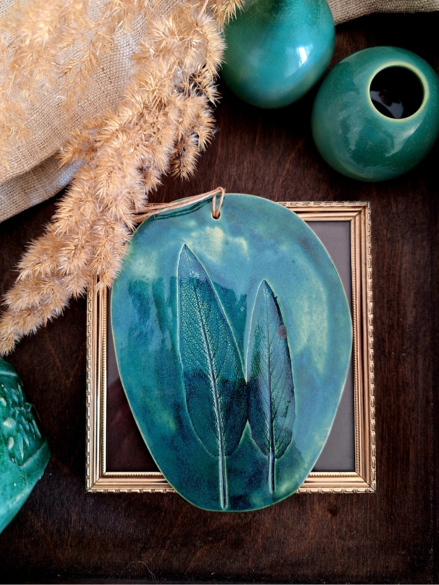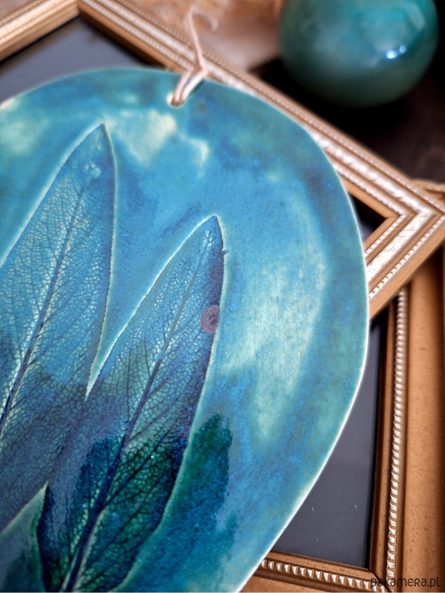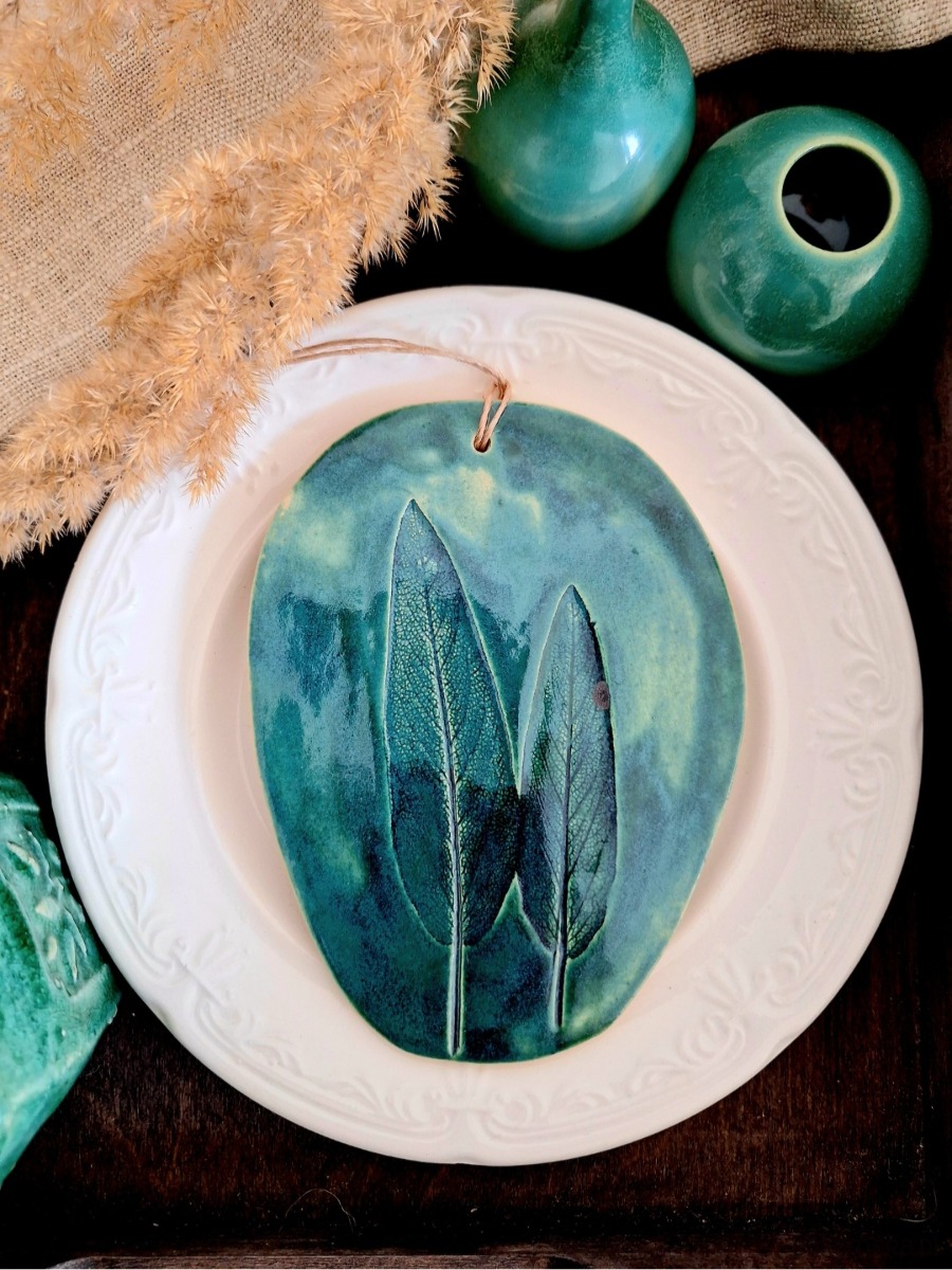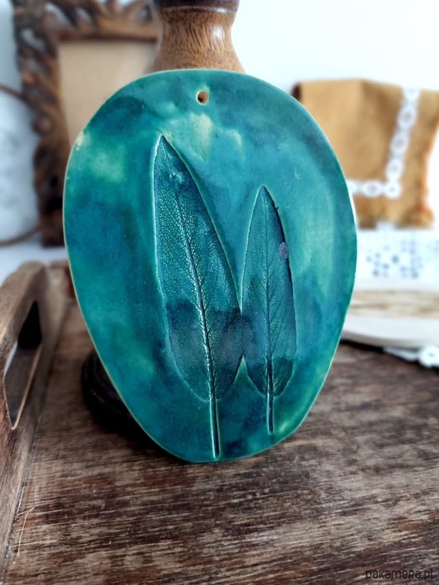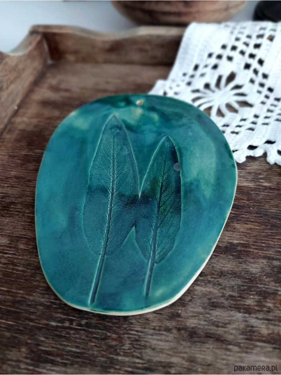 Ceramiczna zawieszka z motywem roślinnym. Nadruk roślinny wykonany został ręcznie z prawdziwych liści. Dekoracja posłużyć może jako dekor ścienny, ewentualnie podstawka. Ręcznie wykonana ozdoba szkliwiona głębokim zielonym kolorem podkreślającym strukturę rośliny. Wyjątkowa ozdoba o nietuzinkowym charakterze, dla miłośnika natury.