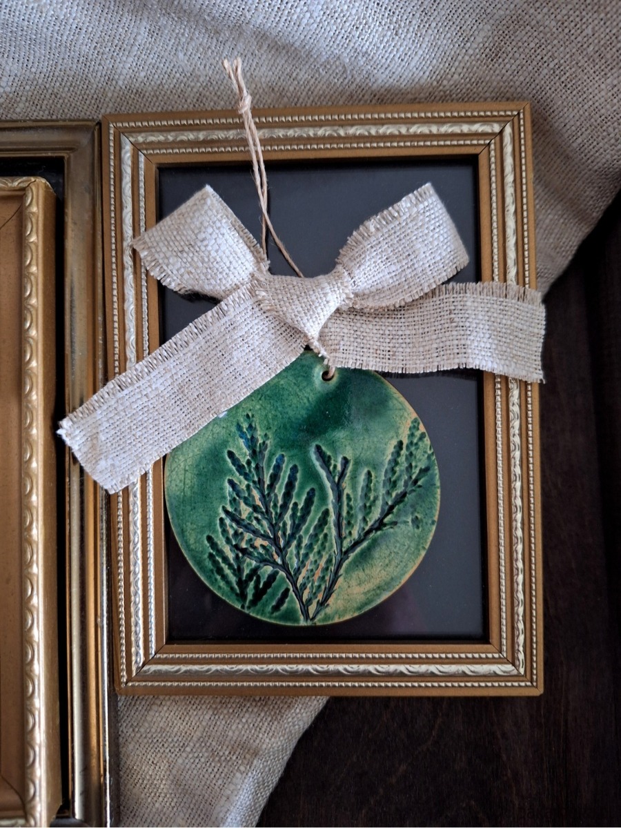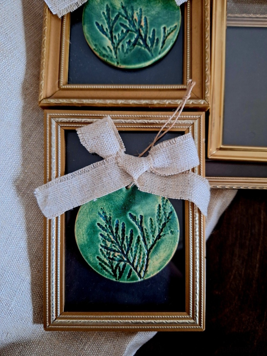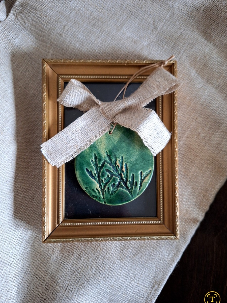 Ceramiczne zawieszki z motywem roślinnym zdobione materiałową wstążką. Nadruk roślinny wykonany został ręcznie z prawdziwych gałązek roślinnych. Dekoracja posłużyć może jako dekor ścienny, ewentualnie podstawka. Ręcznie wykonana ozdoba szkliwiona głębokim zielonym kolorem podkreślającym strukturę rośliny. Wyjątkowa ozdoba o nietuzinkowym charakterze, dla miłośnika natury oraz wielbiciela drobnej ceramiki dekoracyjnej. Wstążka z kolorach ziemi nadaje boho charakteru.