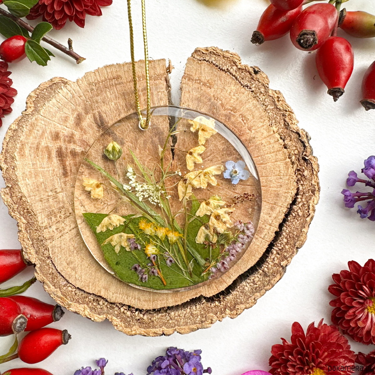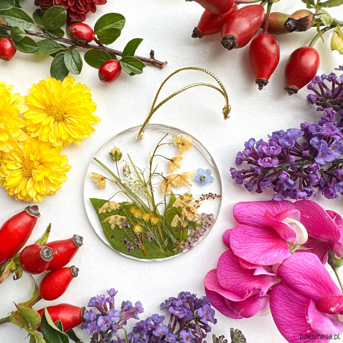 Ręcznie robiona świąteczna zawieszka z suszonymi kwiatami w kształcie okręgu to wyjątkowa dekoracja i niebanalny prezent na choinkę.