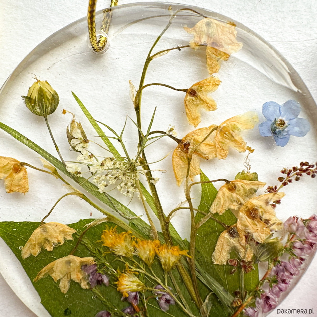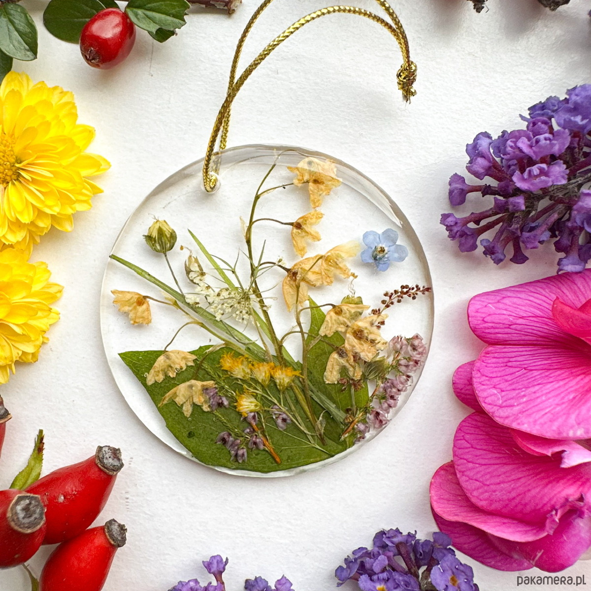 Zatopione w żywicy prawdziwe trawy, liście i rośliny łąkowe tworzą botaniczną kompozycję w stylu boho. To idealny upominek dla osób, które kochają naturę, oryginalne dodatki i unikatowy styl.