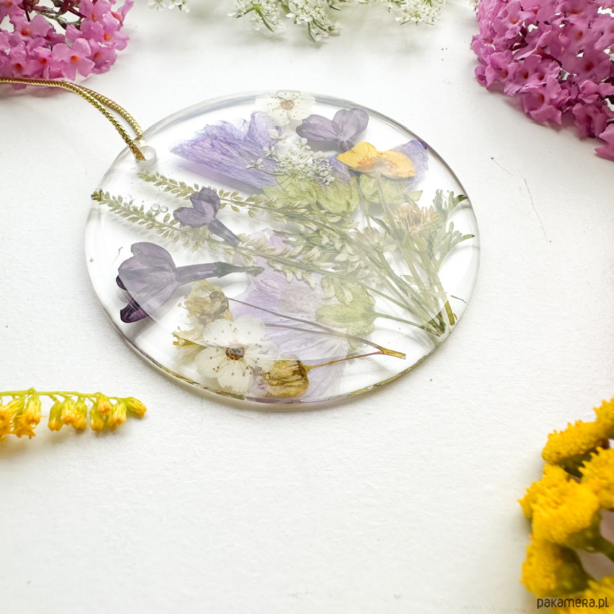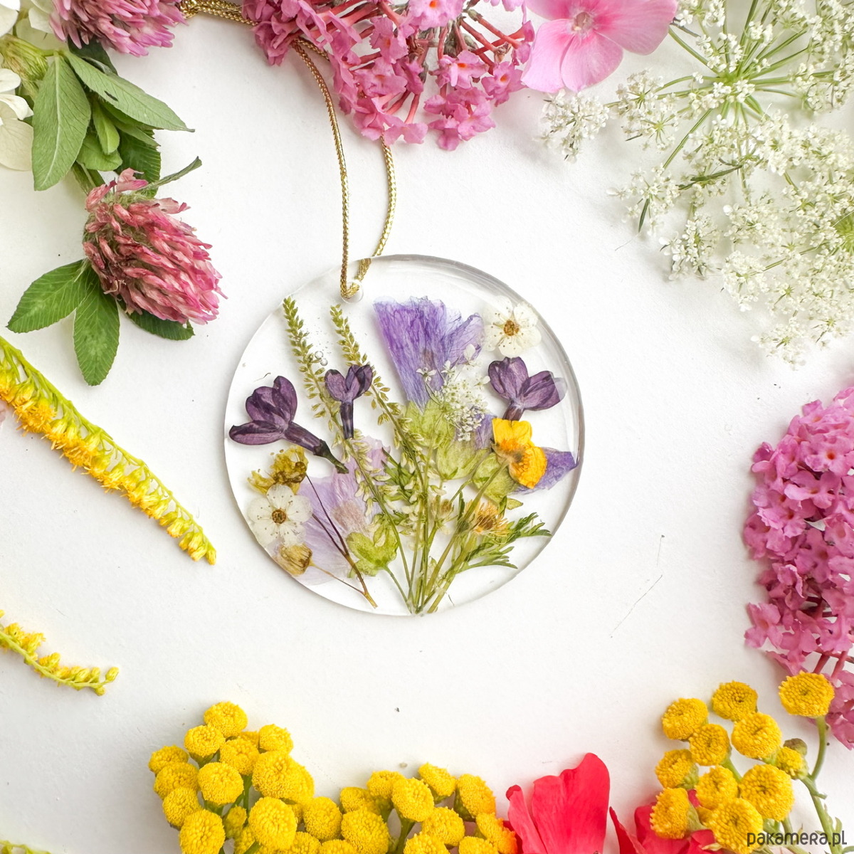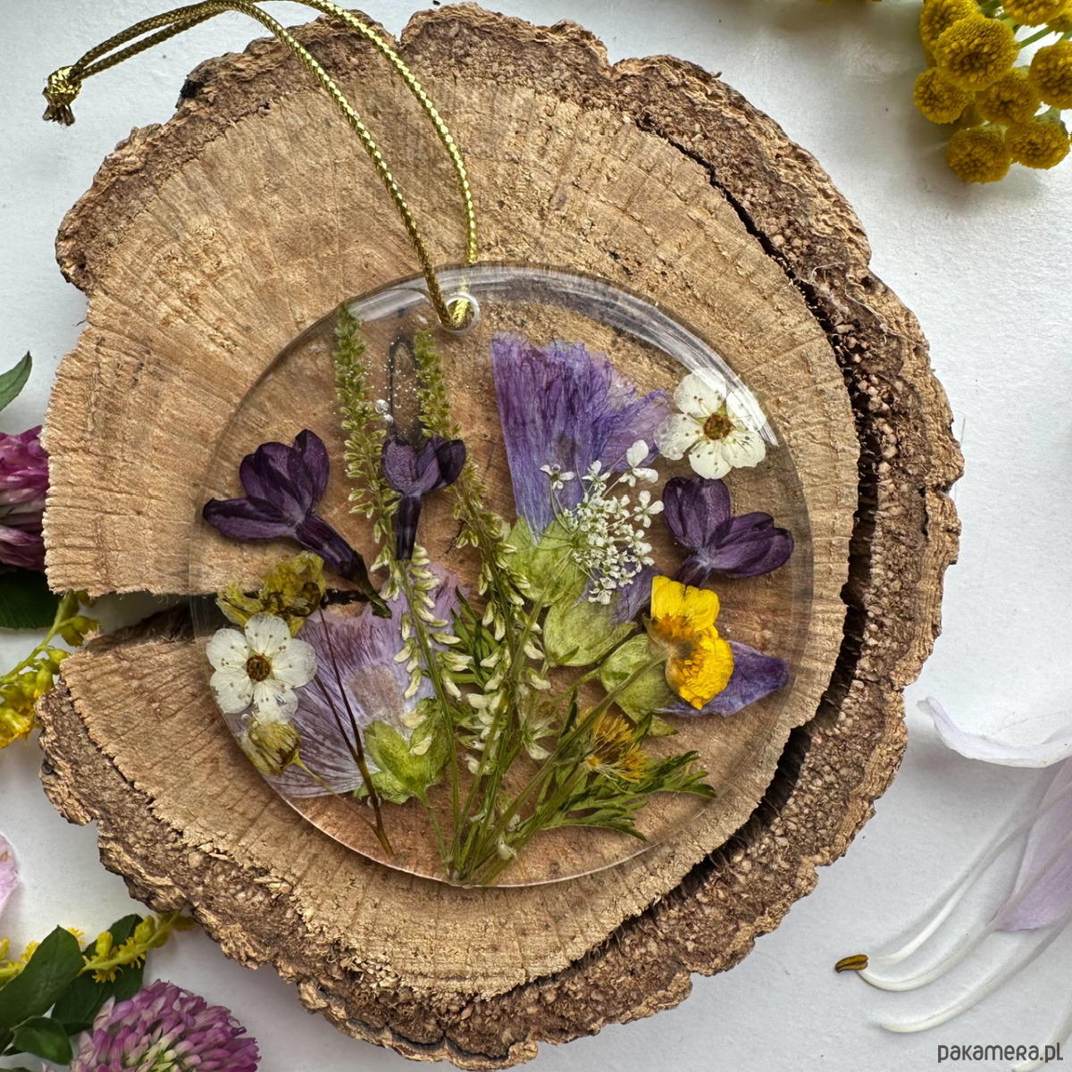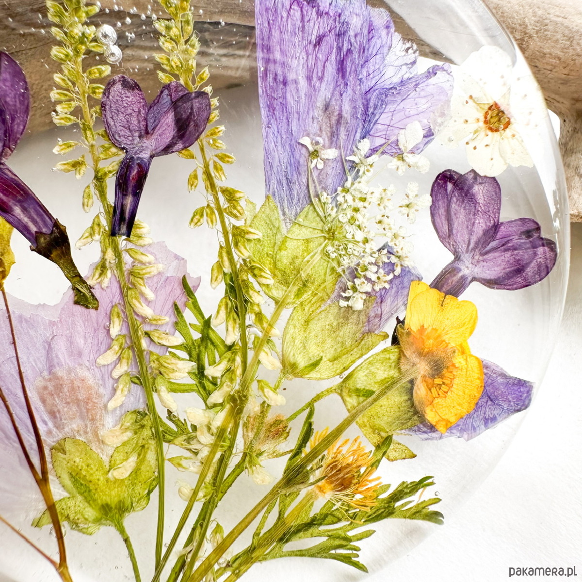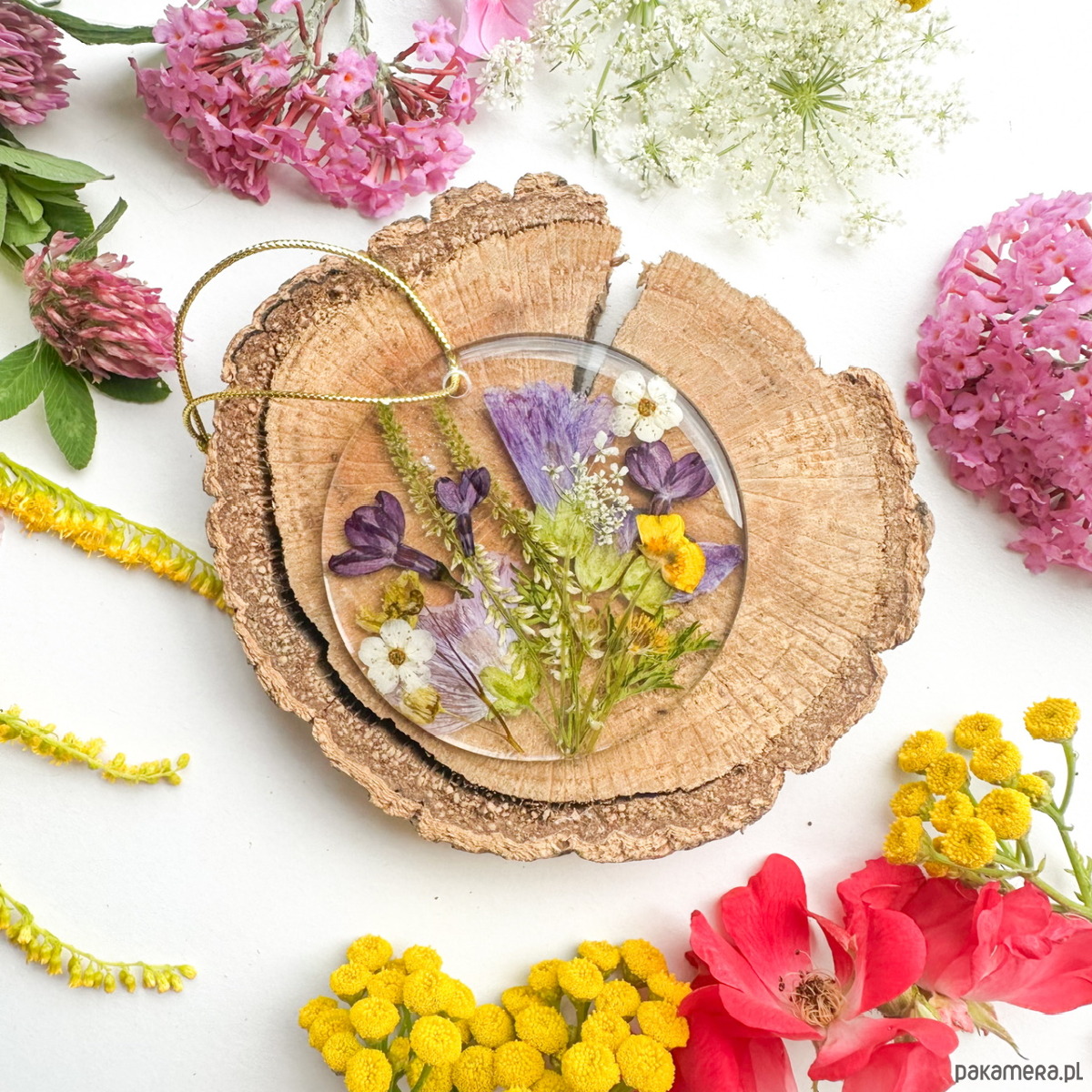 Zatopione w żywicy prawdziwe trawy, liście i rośliny łąkowe tworzą botaniczną kompozycję w stylu boho. To idealny upominek dla osób, które kochają naturę, oryginalne dodatki i unikatowy styl.