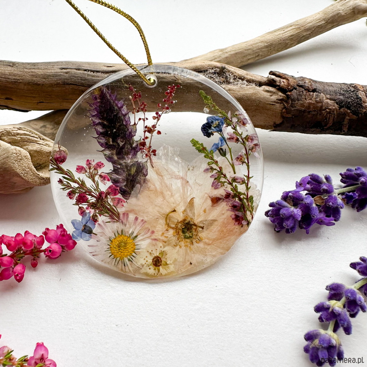 Zatopione w żywicy prawdziwe trawy, liście i rośliny łąkowe tworzą botaniczną kompozycję w stylu boho. To idealny upominek dla osób, które kochają naturę, oryginalne dodatki i unikatowy styl.