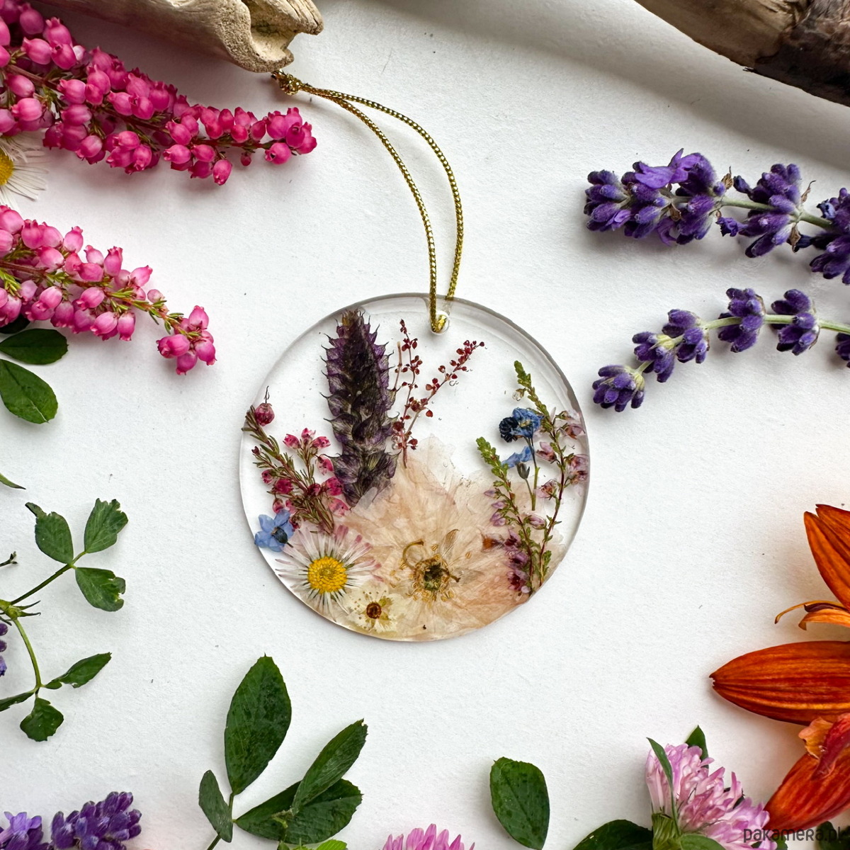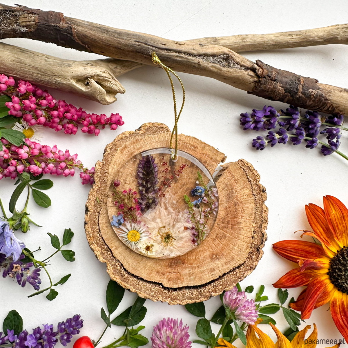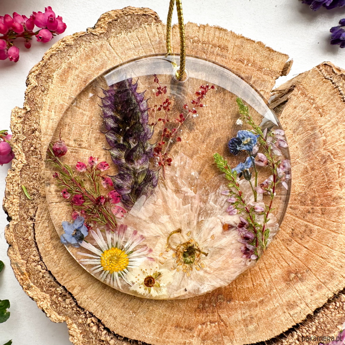 Ręcznie robiona świąteczna zawieszka z suszonymi kwiatami w kształcie okręgu to wyjątkowa dekoracja i niebanalny prezent na choinkę.