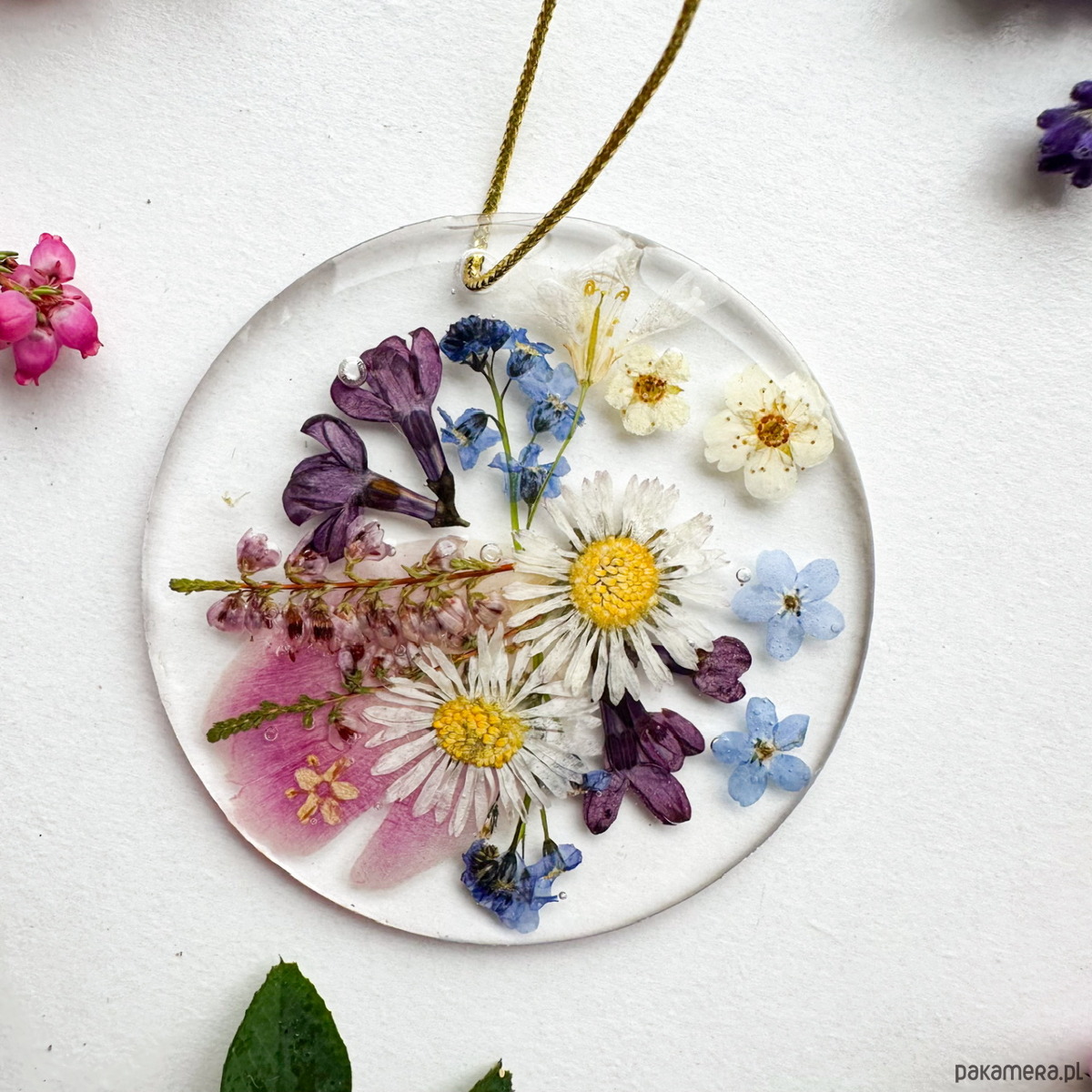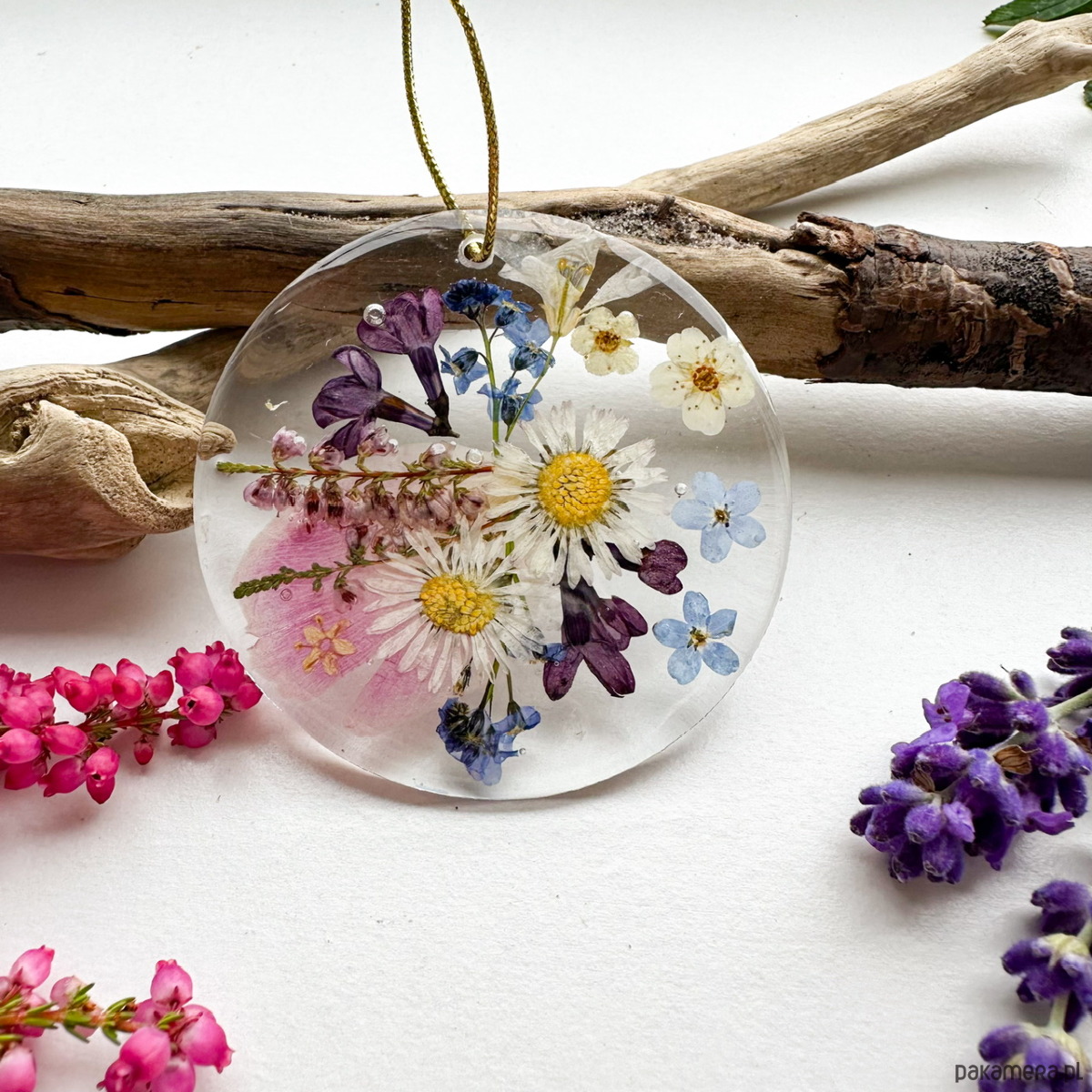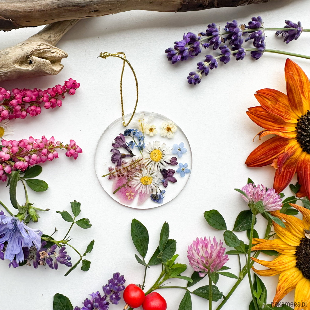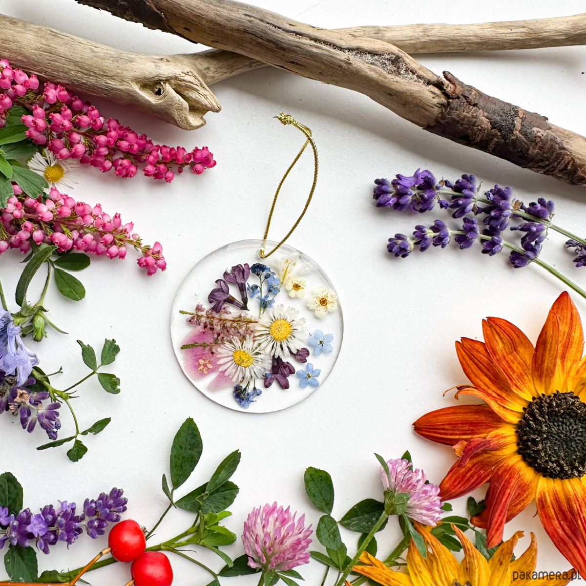 Ręcznie robiona świąteczna zawieszka z suszonymi kwiatami w kształcie okręgu to wyjątkowa dekoracja i niebanalny prezent na choinkę.