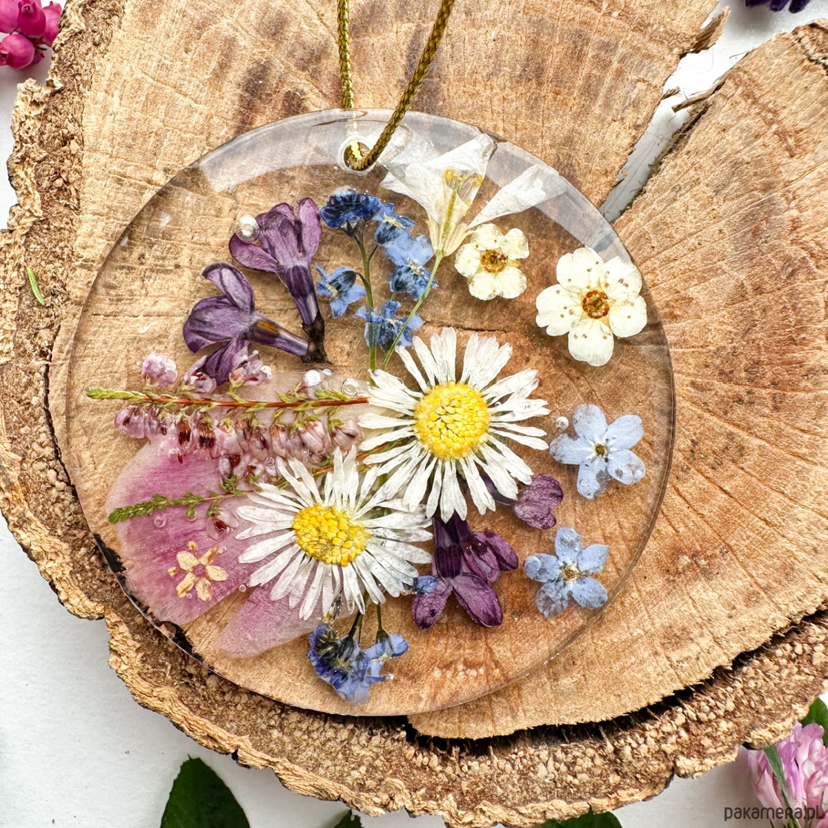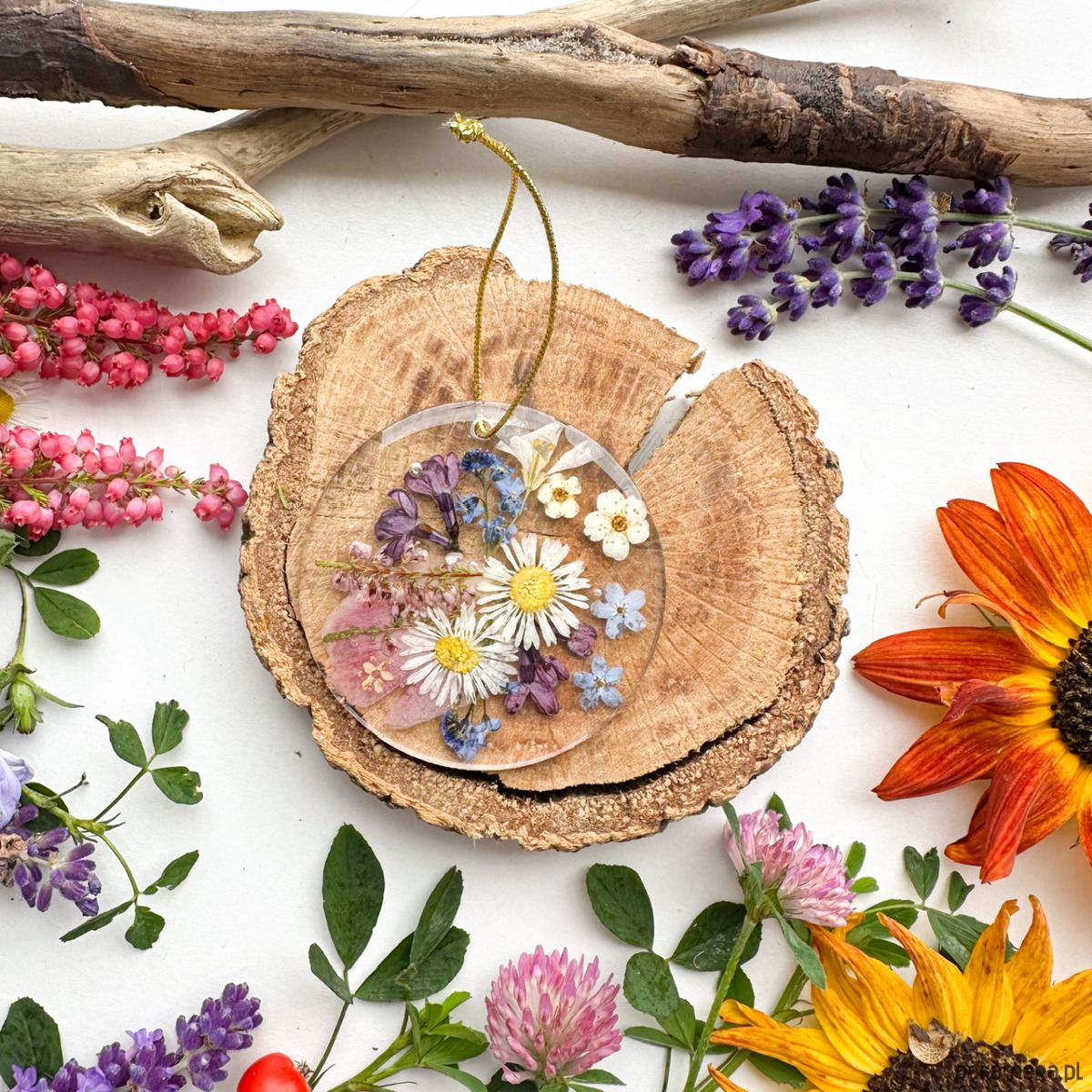 Zatopione w żywicy prawdziwe trawy, liście i rośliny łąkowe tworzą botaniczną kompozycję w stylu boho. To idealny upominek dla osób, które kochają naturę, oryginalne dodatki i unikatowy styl.