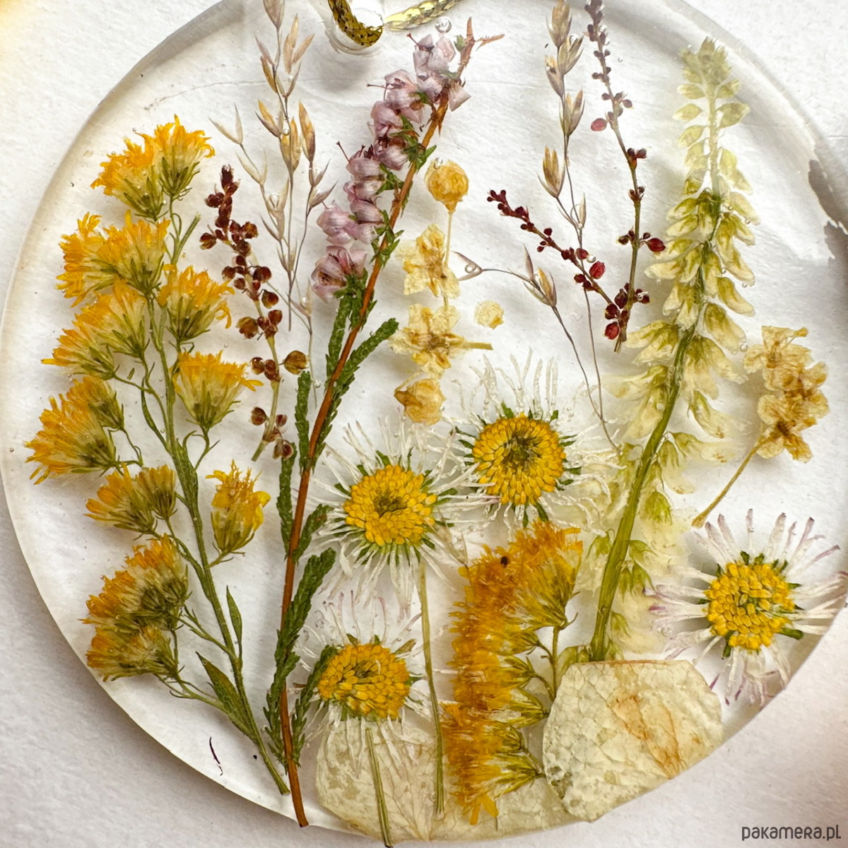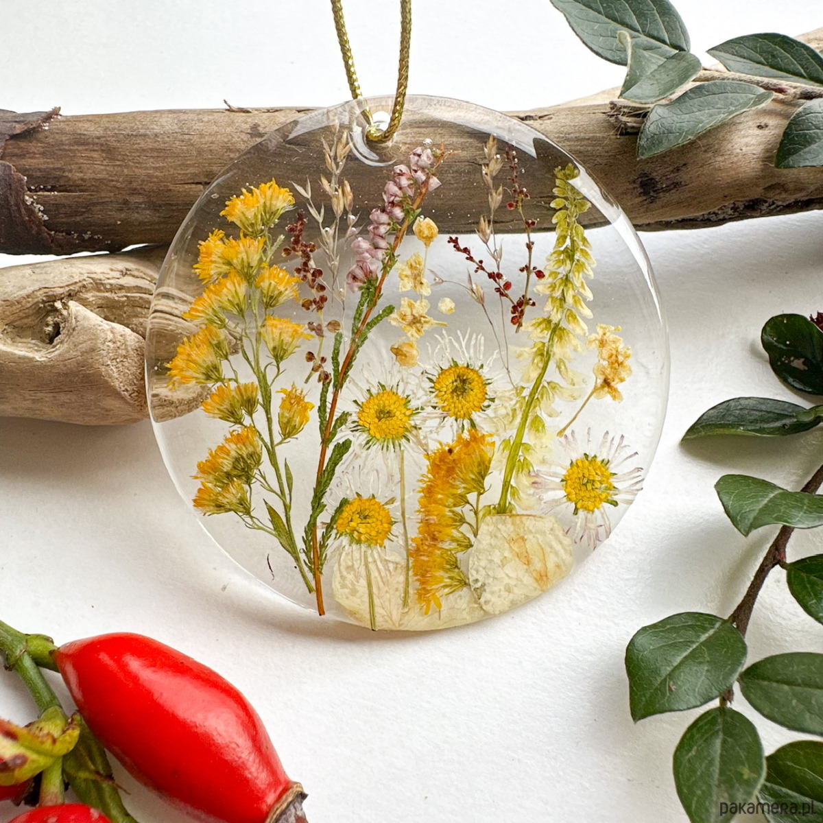 Zatopione w żywicy prawdziwe trawy, liście i rośliny łąkowe tworzą botaniczną kompozycję w stylu boho. To idealny upominek dla osób, które kochają naturę, oryginalne dodatki i unikatowy styl.