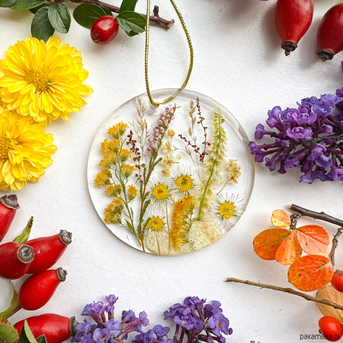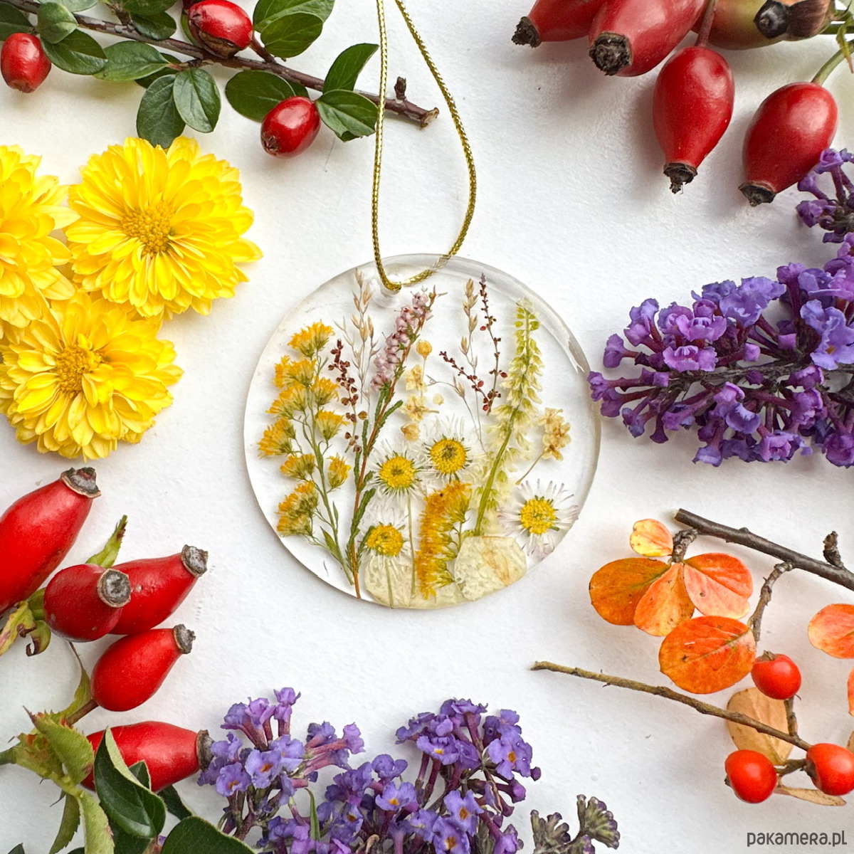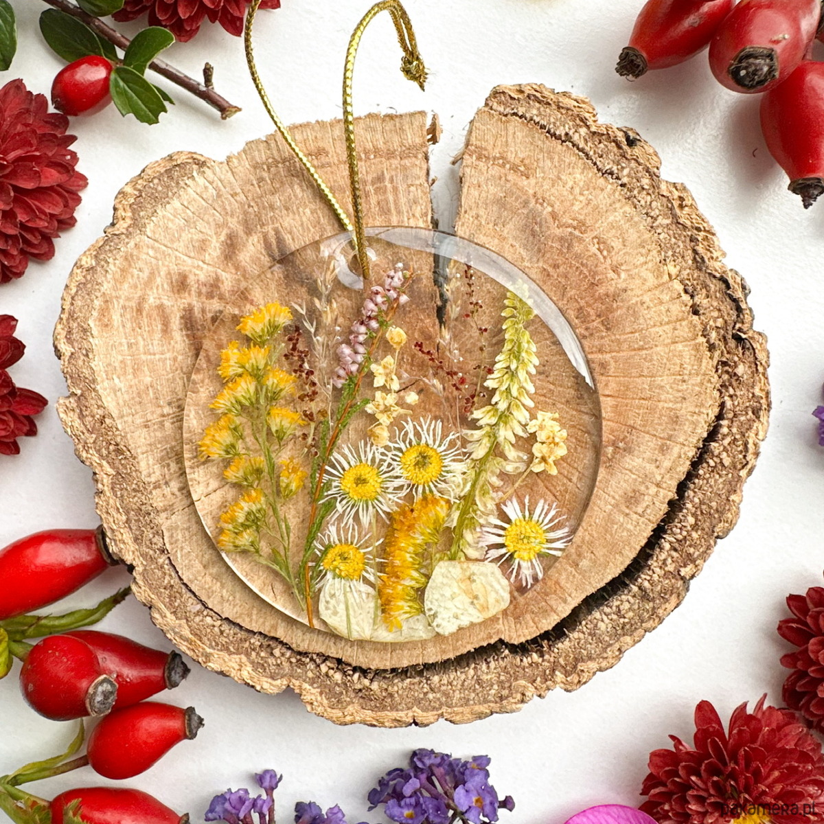 Ręcznie robiona świąteczna zawieszka z suszonymi kwiatami w kształcie okręgu to wyjątkowa dekoracja i niebanalny prezent na choinkę.