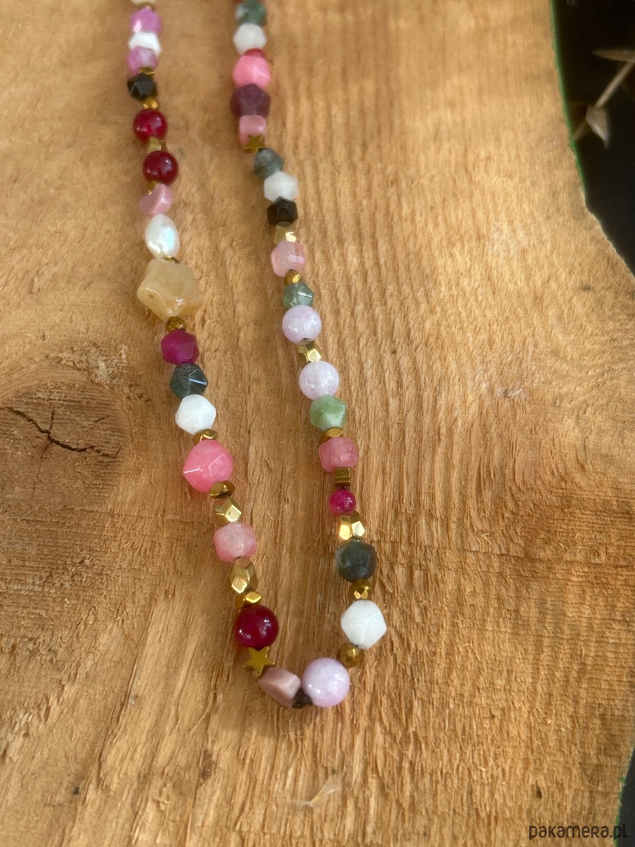 Kolorowa zawieszka ręcznie wykonana z najróżniejszymi kamieniami: rubin, hematyt, turmalin, agat, perła, granat, kwarc różowy, kamień księżycowy