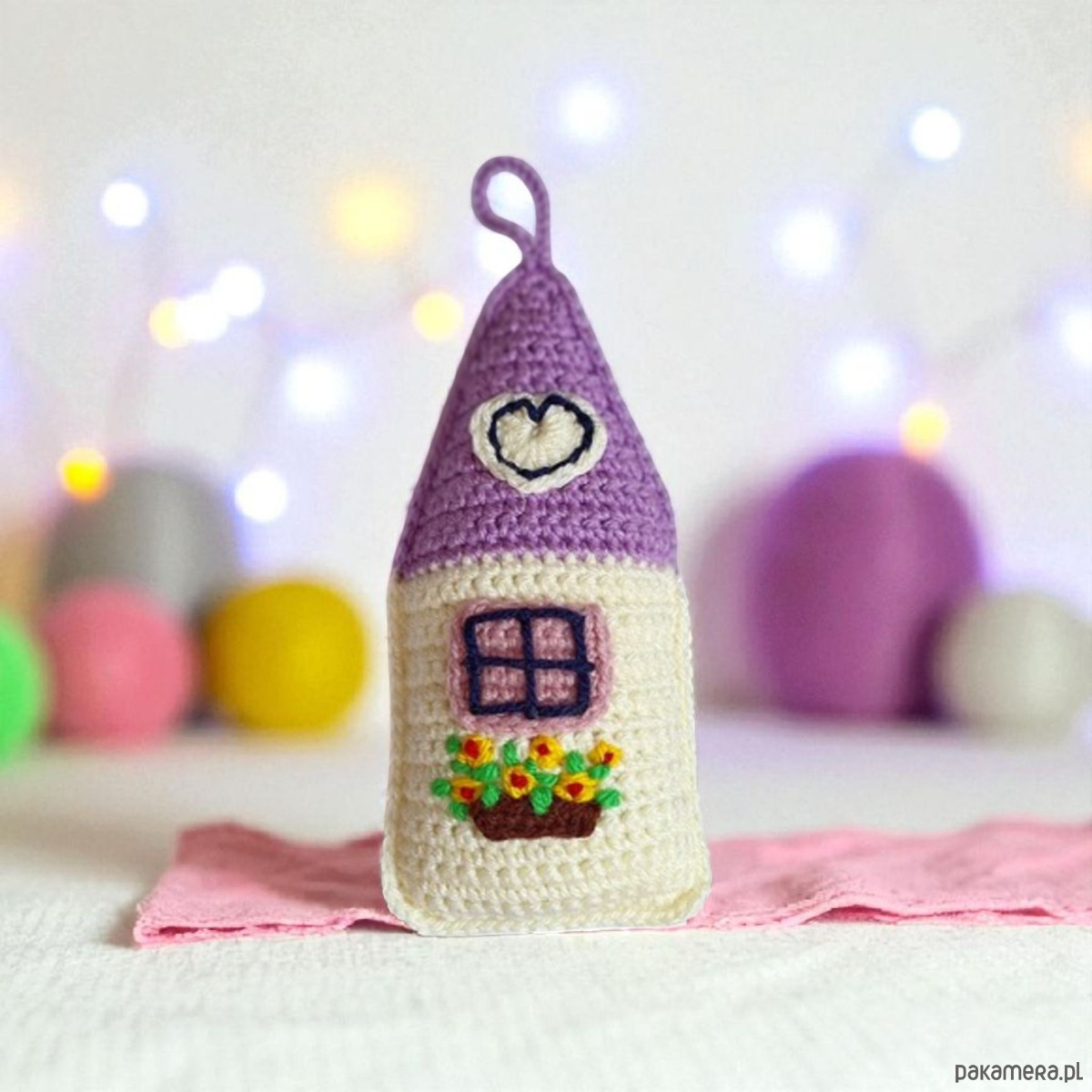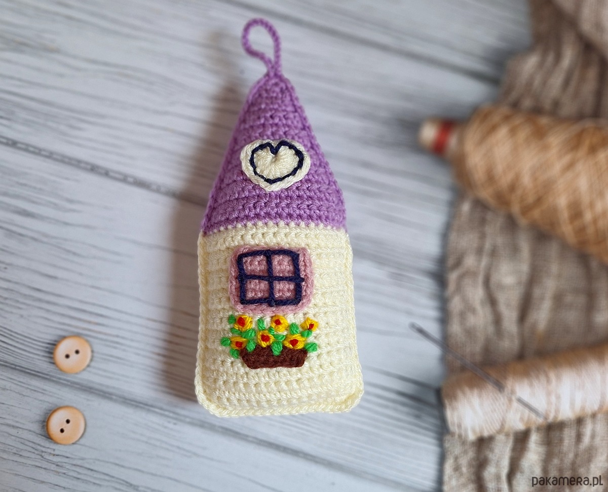 Urocza zawieszka domek, wykonana na szydełku z włóczki.