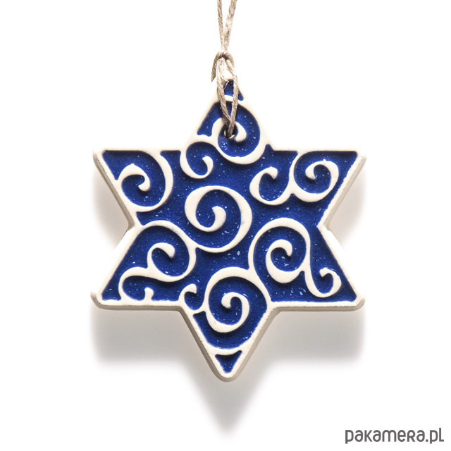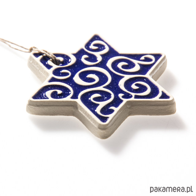 Ceramiczna, ornamentowa gwiazdka do zawieszenia np. na choince. Wykonana z jasnej gliny, jednostronnie pokryta błyszczącym ciemnoniebieskim szkliwem. Polecam serdecznie.