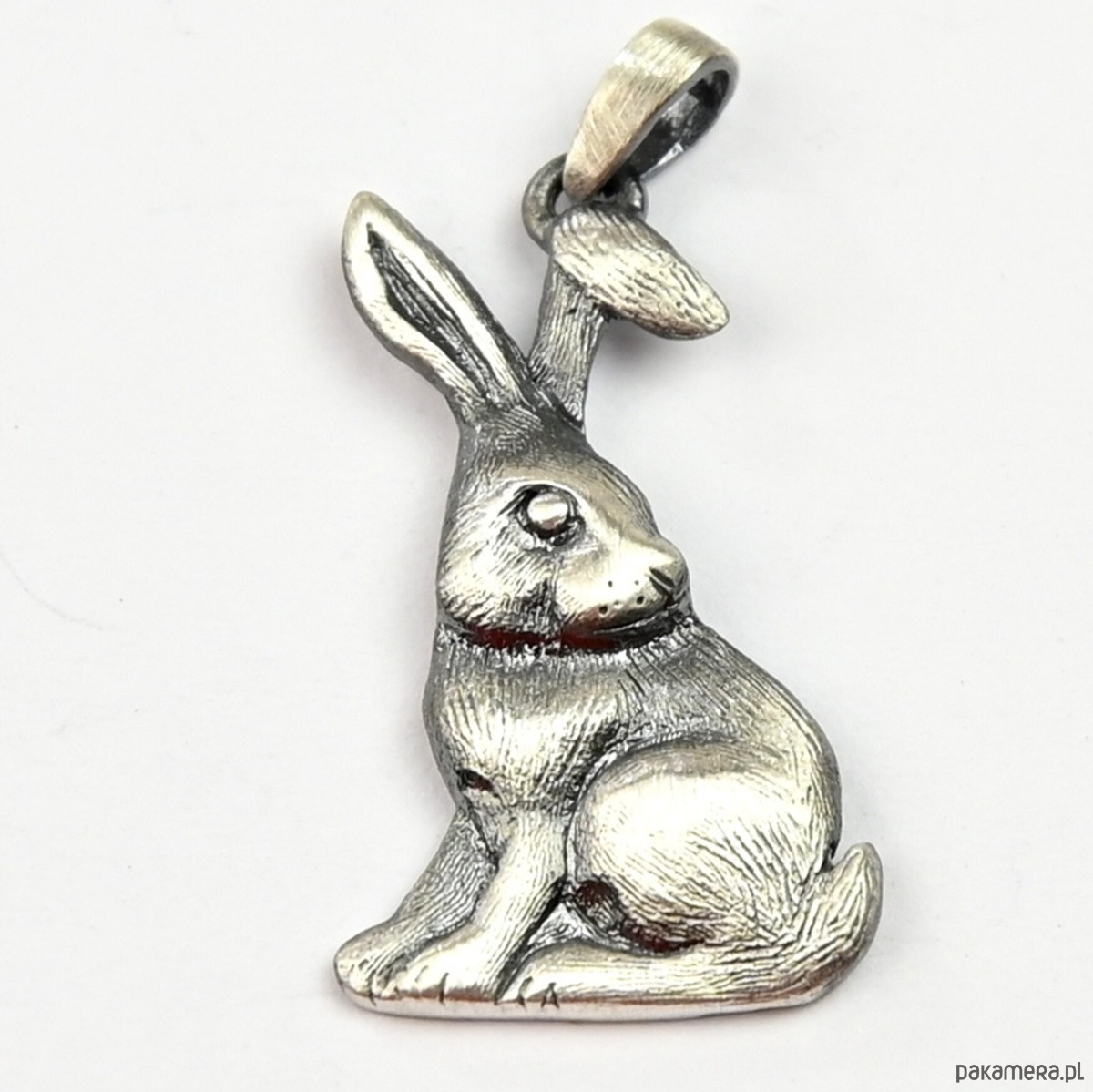 Mały zajączek z oklapniętym uszkiem - symbol czułości i delikatności, zamknięty w srebrze, które szepcze historie lasu.