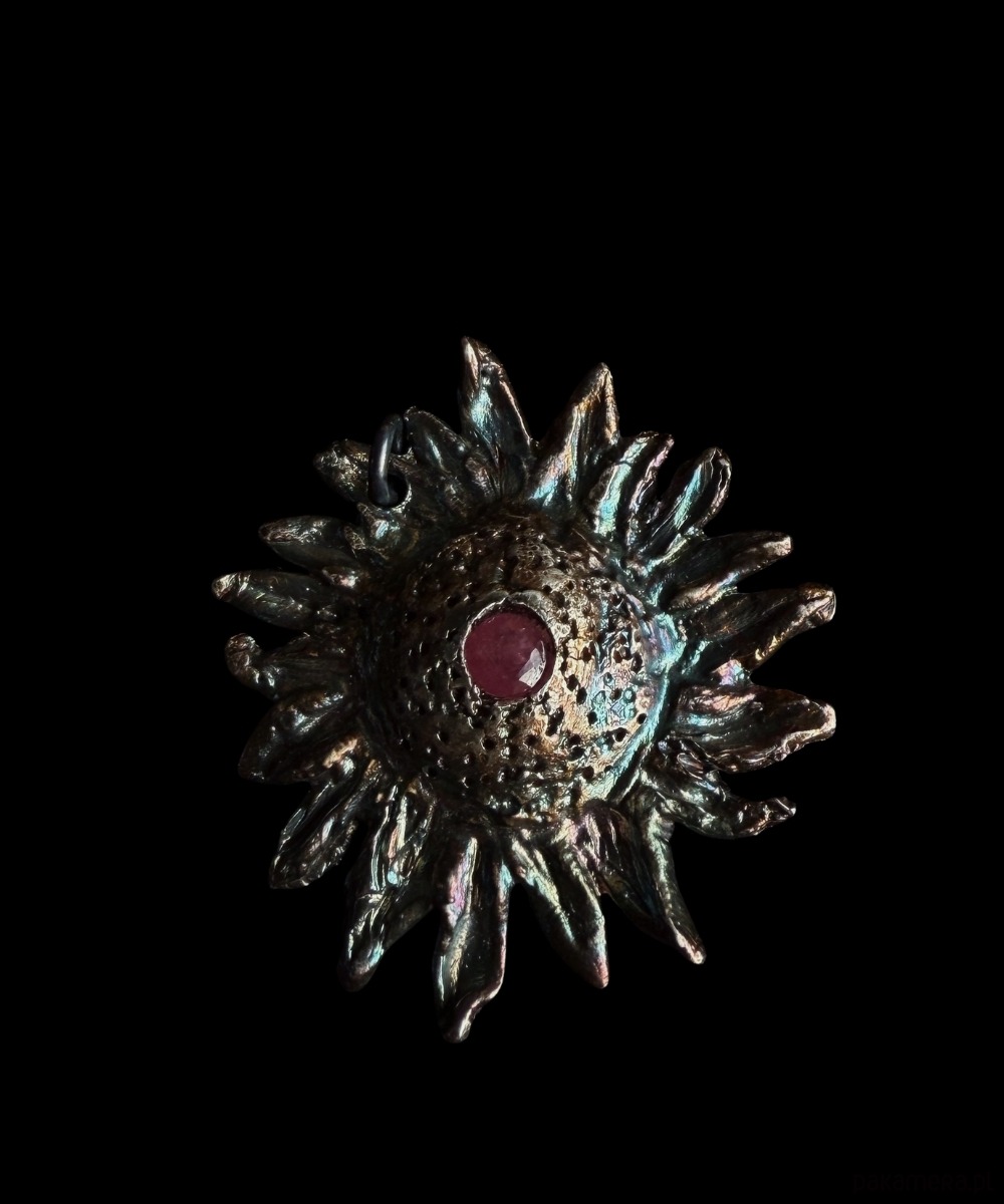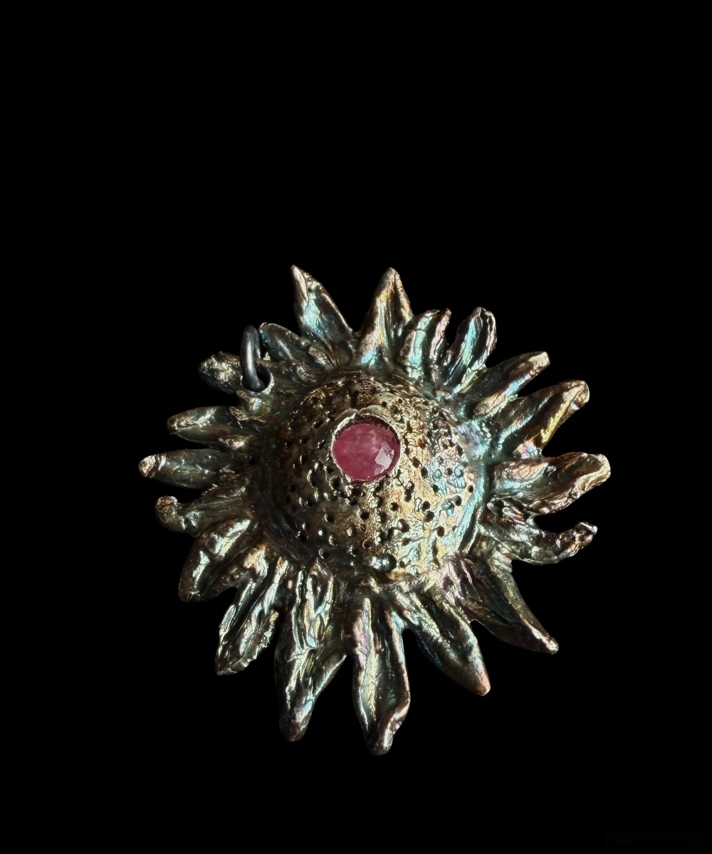 Zawieszka wykonana ze srebra najwyższej próby Art Clay Silver 999 z rubinem.