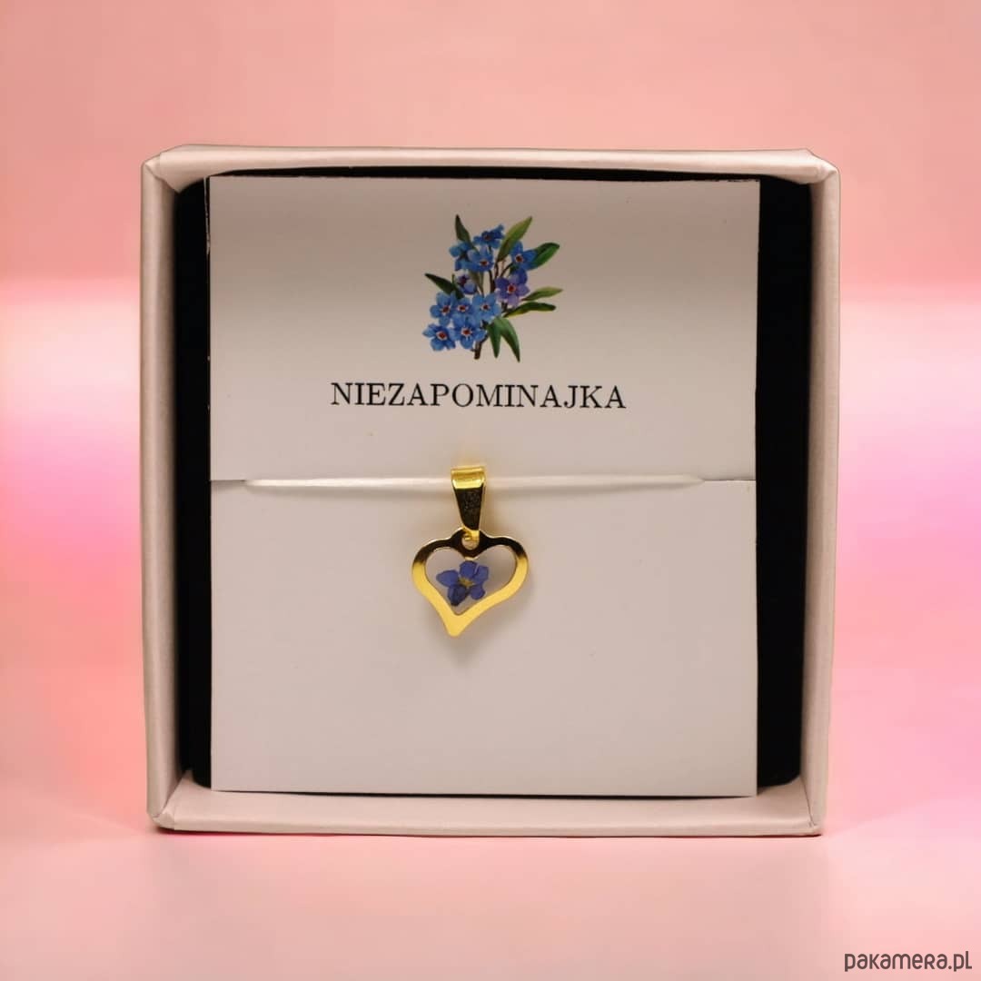 Złote serce (?) otacza kwiat, symbolizując miłość, ciepło i opiekę, które łączą się z sentymentalnym przekazem Niezapominajki - Nie zapomnij o mnie. ???