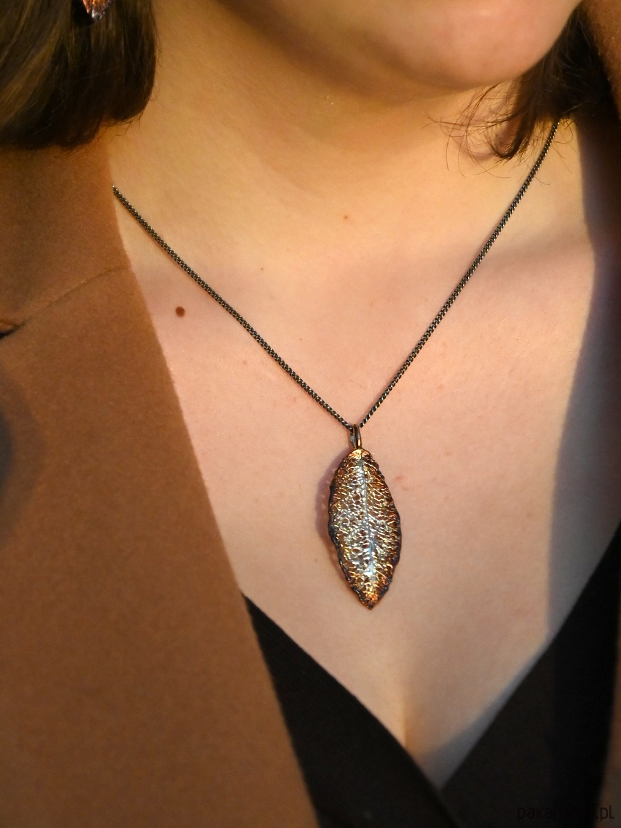 Misternie utkana w srebrze przepiękna zawieszka, jak jesienny liść, który przypadkiem opadł na Twoim dekolcie.