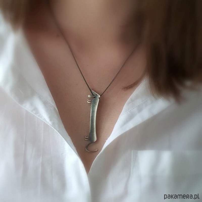 Figlarna zawieszka srebrna przedstawiająca uroczego jamnika w wersji dużej. Całość została zoksydowana na szary kolor, a kontury delikatnie wycieniowane nadając całości wyrazisty charakter. Element służący do zawieszenia wisiorka umieszczony w tylnej części dzięki czemu nie jest on widoczny. Długość jamnika: 7 cm, szerokość: 1,8 cm. Zawieszka sprzedawana bez łańcuszka.