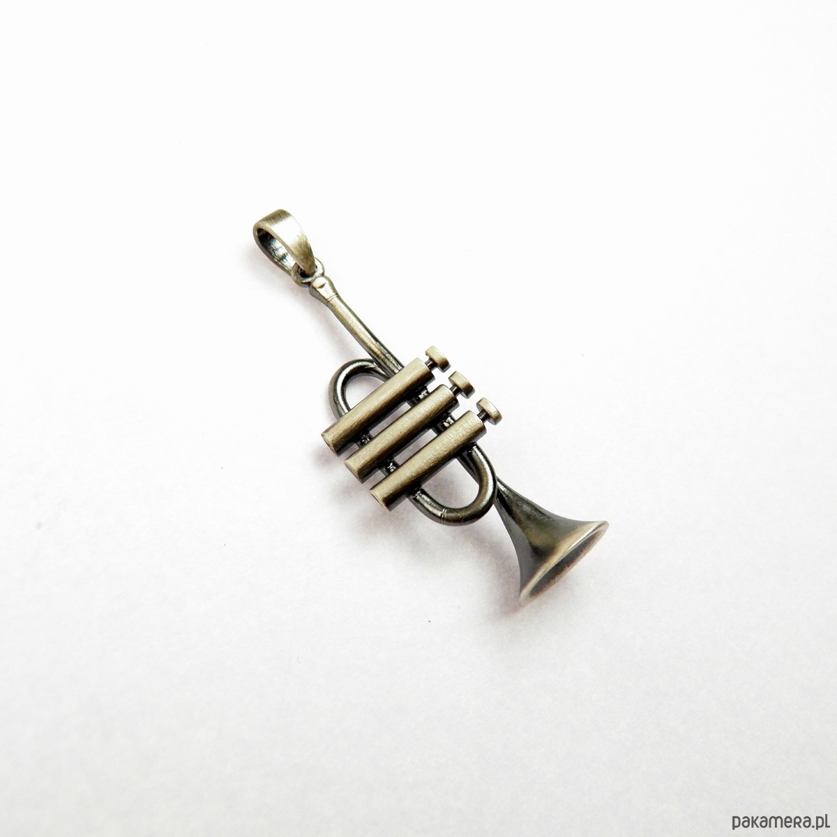 Niezwykle oryginalna zawieszka srebrna w kształcie trąbki. Pokryta oksydą i wypolerowana. Długość zawieszki 4 cm. Próba srebra 925. Niebanalna ozdoba, która podkreśli twój styl. Wisiorek sprzedawany bez łańcuszka.