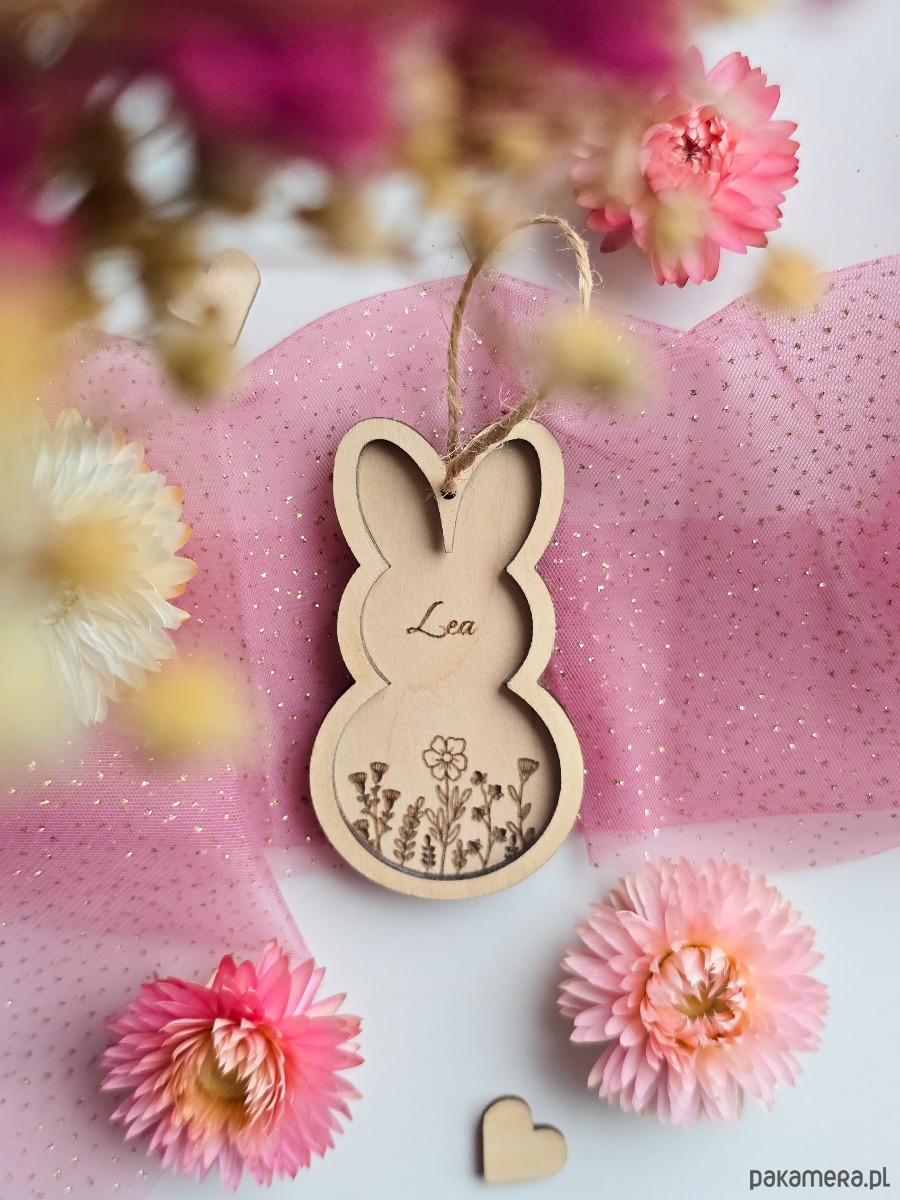 To urocza, mała zawieszka w kształcie królika, idealna do wielkanocnego koszyczka. Personalizowana grawerem z imieniem i delikatnym wiosennym motywem, będzie pięknym detalem. Świetnie sprawdzi się jako ozdoba koszyczka, prezent dla dzieci w przedszkolu / szkole lub uzupełnienie świątecznego wystroju.