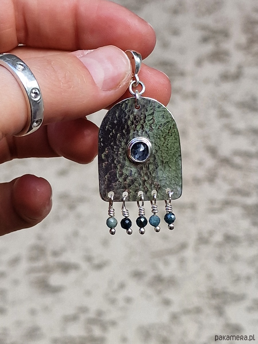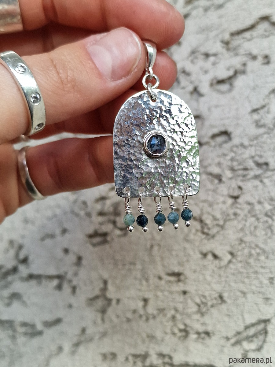 Zawieszka na zamówienie indywidualne. Kyanit okrągły, fasetowany, zakuty w młotkowanej blaszce z zawieszonymi u dołu fasetowanymi turmalinami. Próba srebra 925. Zawieszka wykończona na wysoki poler.