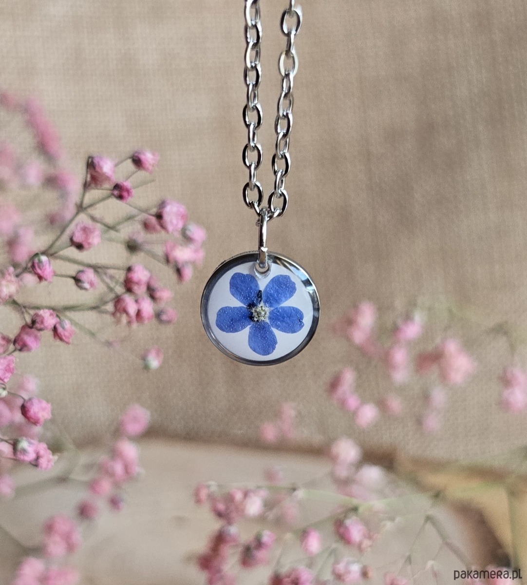 Oferuję Państwu unikalną biżuterię. Zawieszka jest wykonana z suszonych kwiatów i żywicy epoksydowej. Biżuteria jest wspaniałym i oryginalnym prezentem na lata.