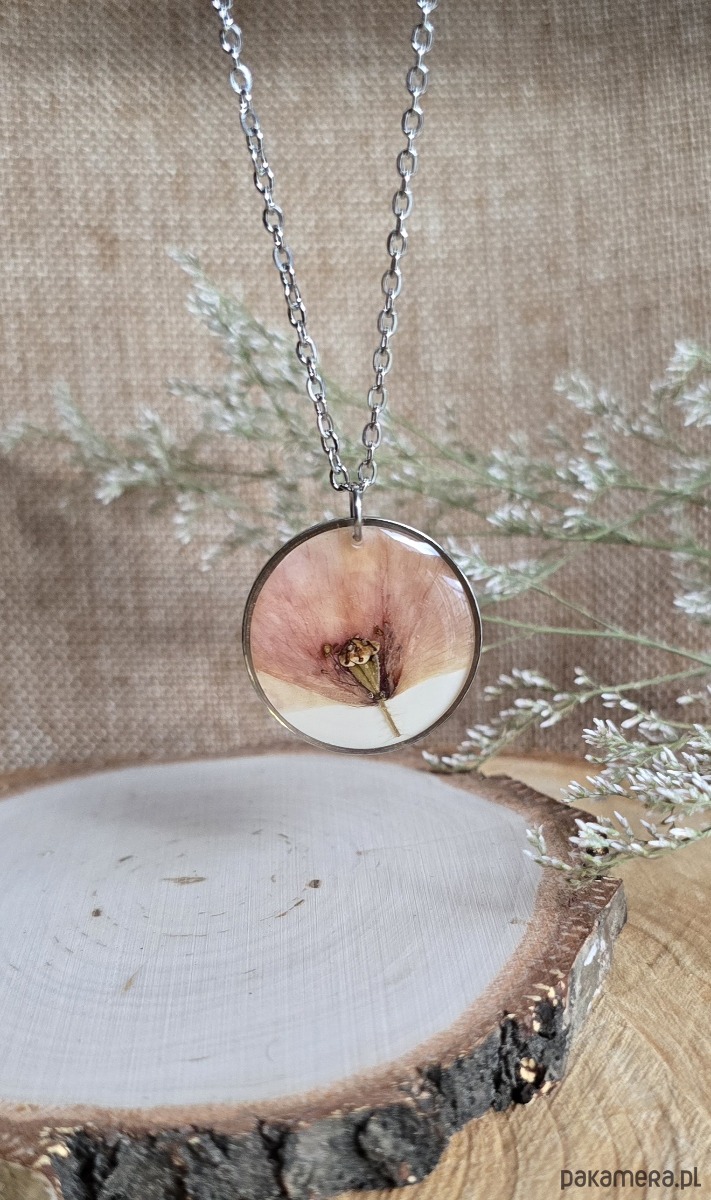 Oferuję Państwu unikalną biżuterię. Zawieszka jest wykonana z suszonych kwiatów i żywicy epoksydowej. Biżuteria jest wspaniałym i oryginalnym prezentem na lata.