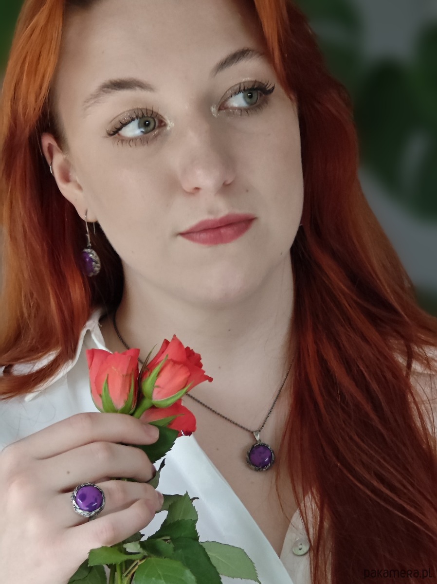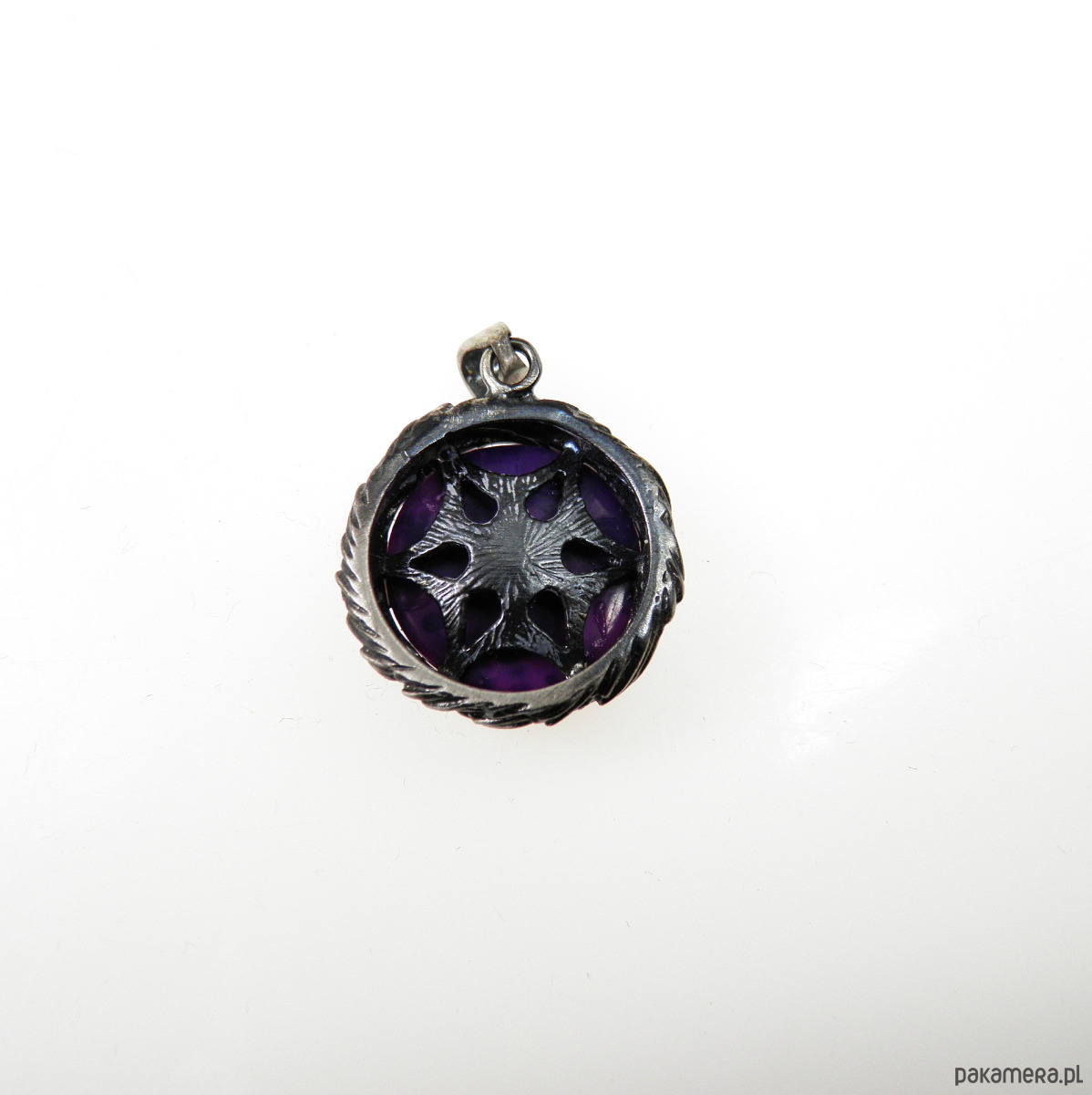 Oksydowana oprawa w kolorze grafitowym nadaje zawieszce unikalny charakter retro. Całkowita długość wynosi 2,5 cm, co sprawia, że jest idealnym dodatkiem do codziennych stylizacji. Średnica oprawy to imponujące 1,8 cm, natomiast kamień sugilitowy o średnicy 1,4 cm dodaje jej subtelnego blasku. Sugilit rekonstruowany - kamień rekonstruowany, metoda ta polega na stapianiu proszku lub drobnych kamieni wybranego minerału (w tym przypadku Sugilit) w wysokiej temperaturze, a następnie powolnym ich ochładzaniu. W ten sposób otrzymuje się duże bloki kamieni, z których można szlifować dowolne kształty.