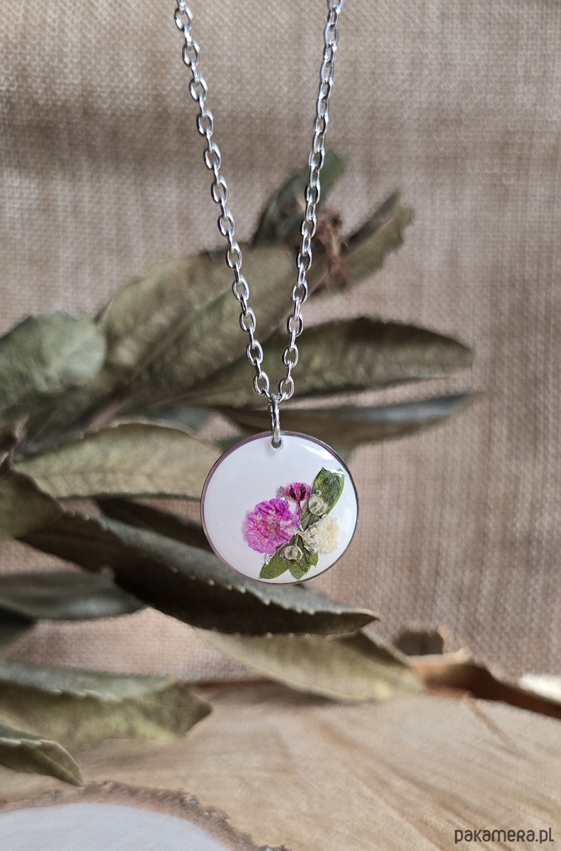 Oferuję Państwu unikalną biżuterię. Zawieszka jest wykonana z suszonych kwiatów i żywicy epoksydowej. Biżuteria jest wspaniałym i oryginalnym prezentem na lata.