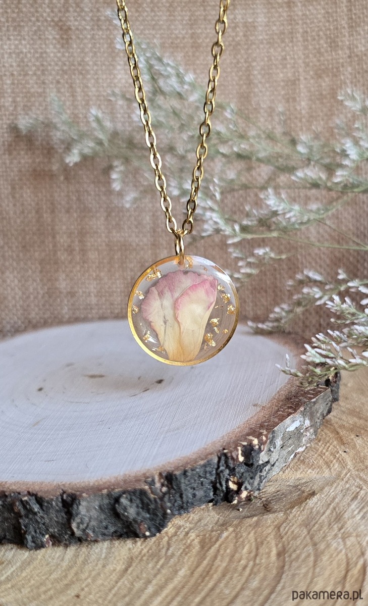 Oferuję Państwu unikalną biżuterię. Zawieszka jest wykonana z suszonych kwiatów i żywicy epoksydowej. Biżuteria jest wspaniałym i oryginalnym prezentem na lata.