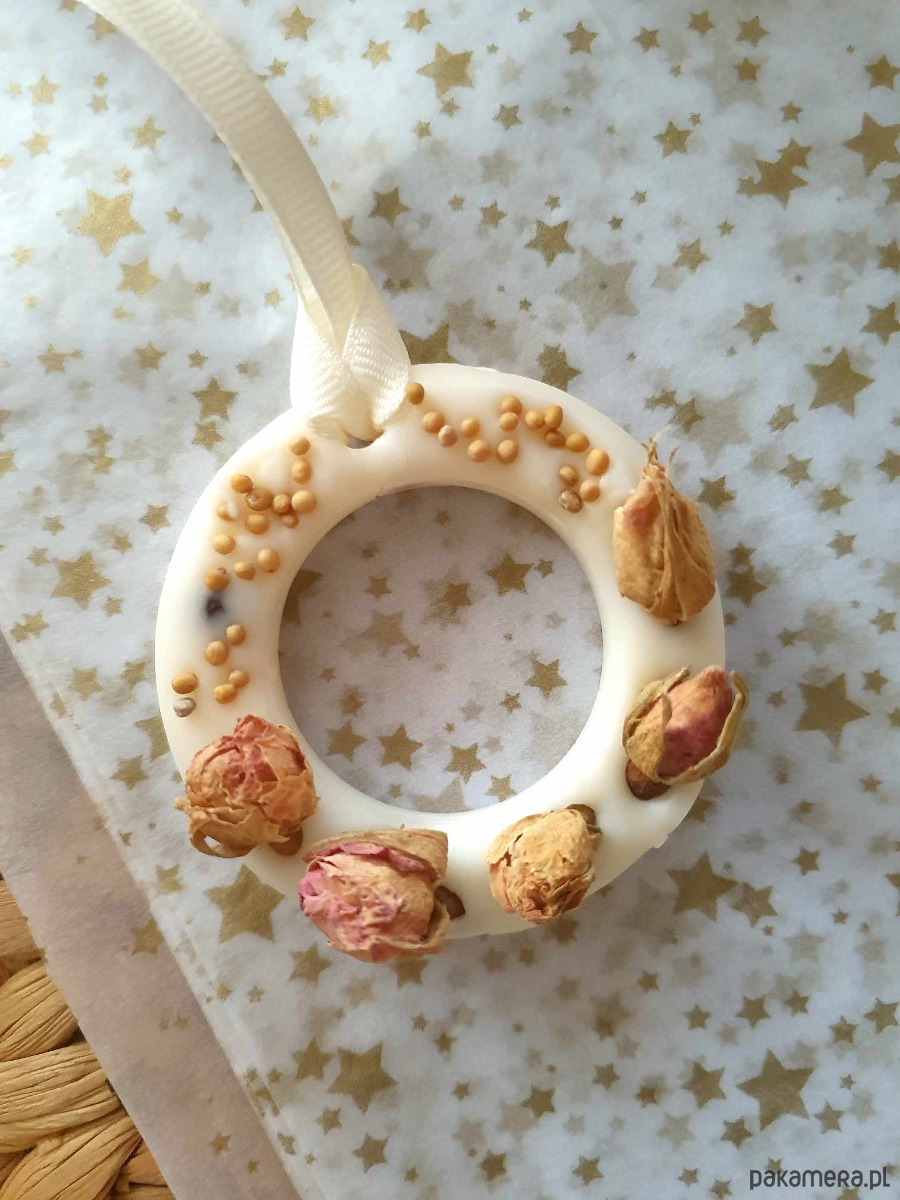 Zawieszka wykonana w 100% z wosku sojowego, ozdobiona ziołami.
