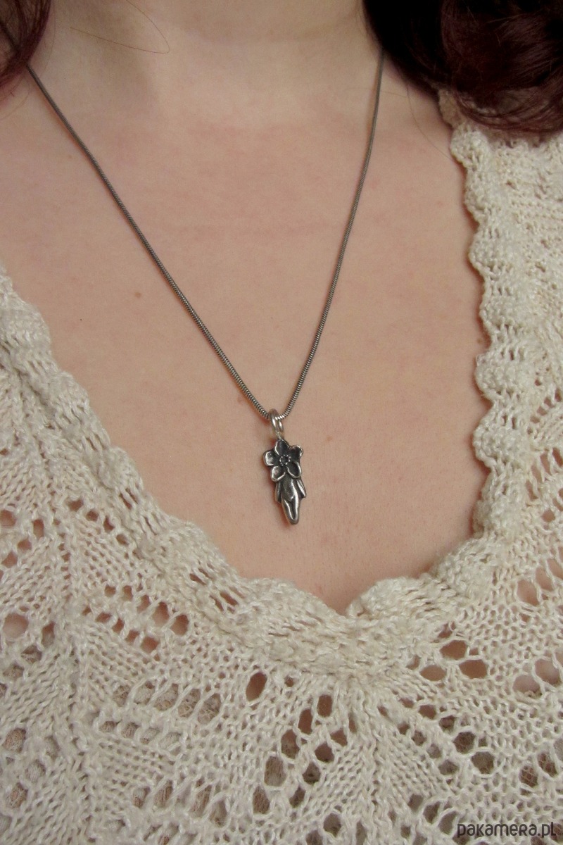 Zawieszka przedstawia postać z Niezapominajką zamiast głowy. Niezapominajka jest symbolem trwałej miłości, troski i pamięci.