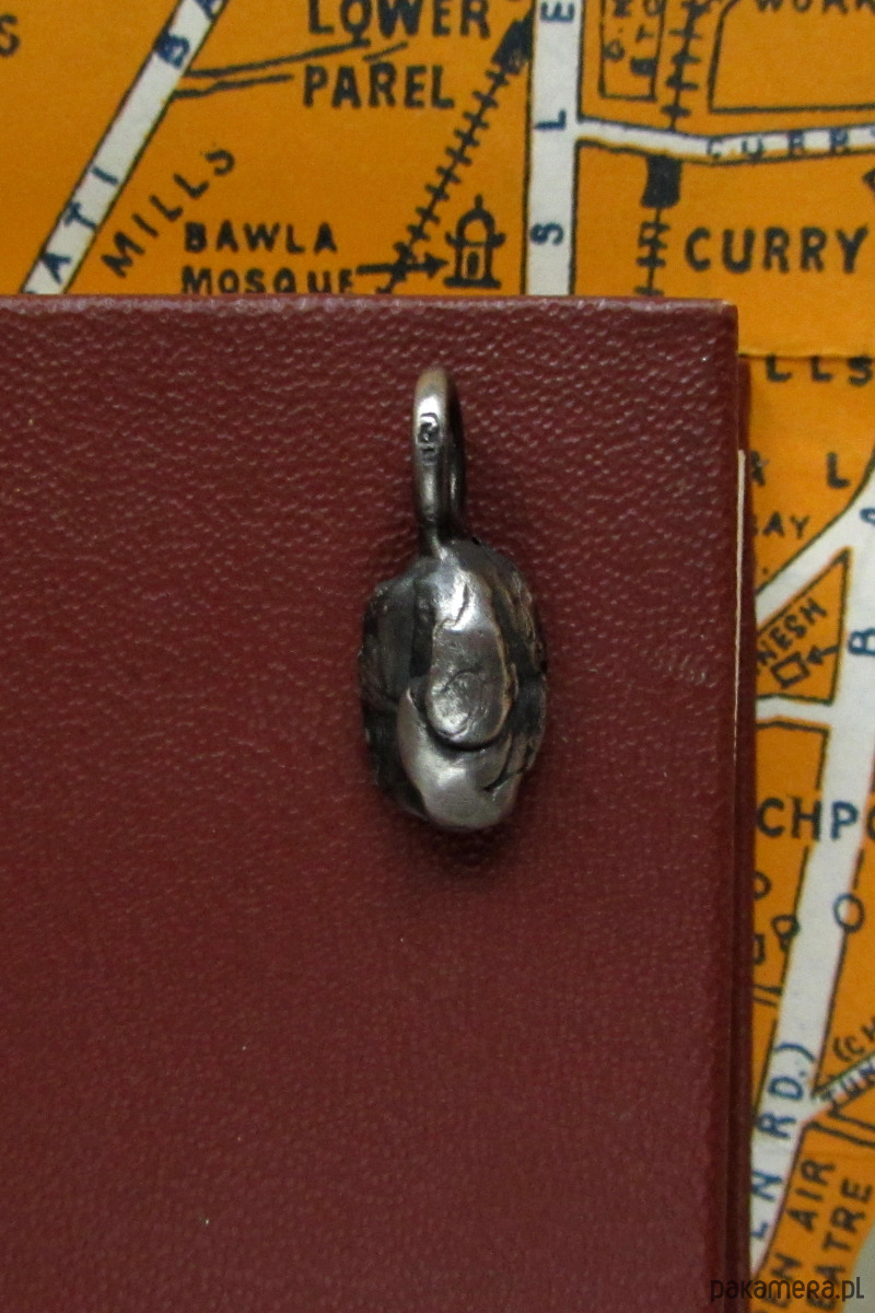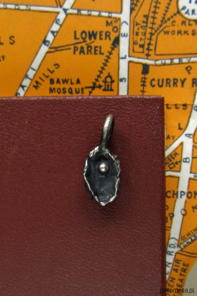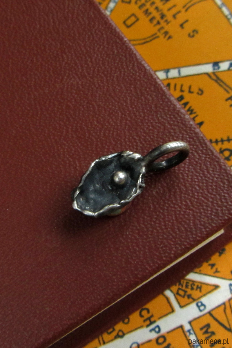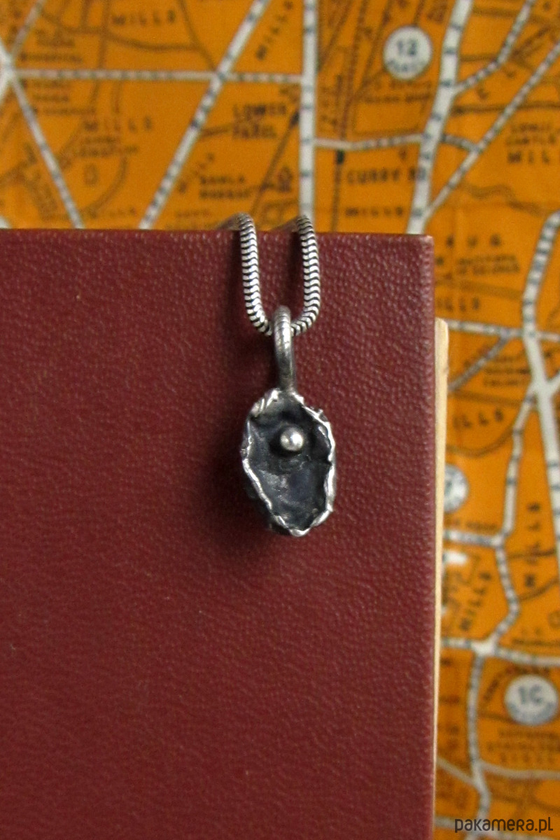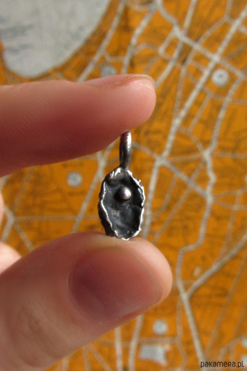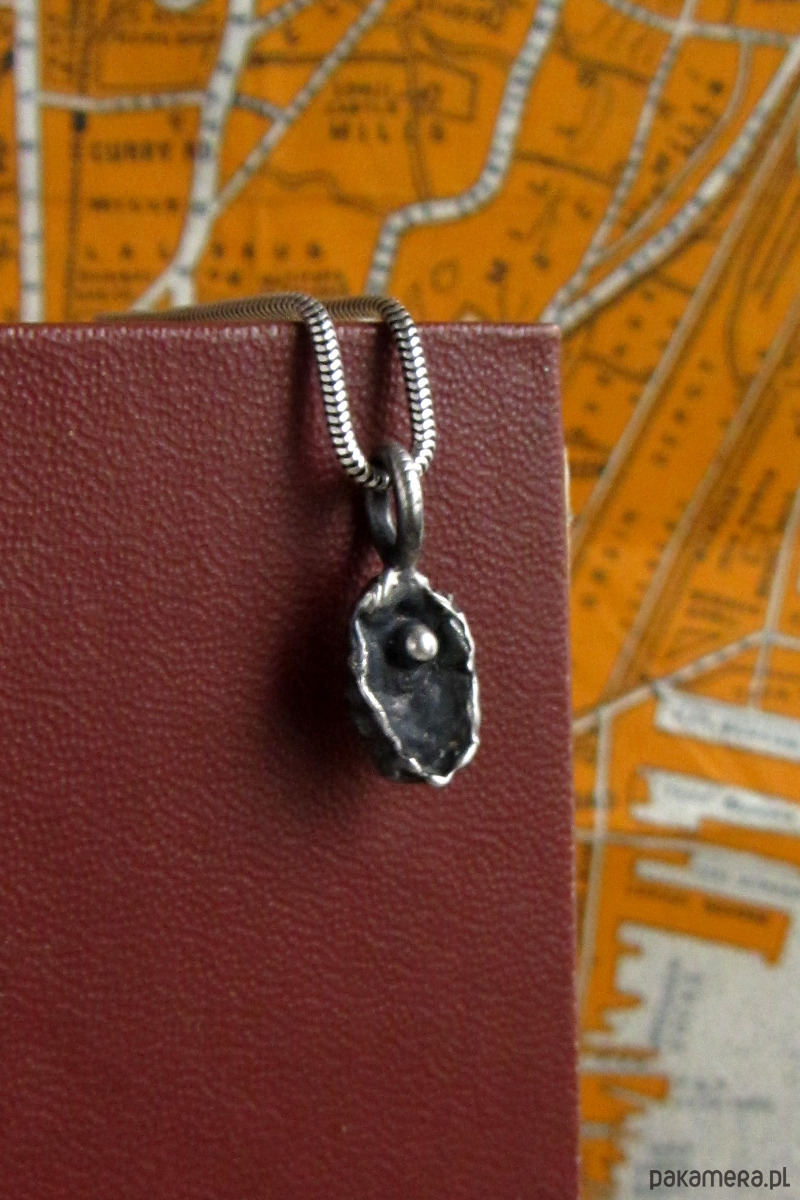 Ręcznie rzeźbiona zawieszka przedstawiająca malutką ostrygę z perłą. Wykonana od podstaw metodą wosku traconego ze srebra próby 875 w krakowskiej pracowni.
