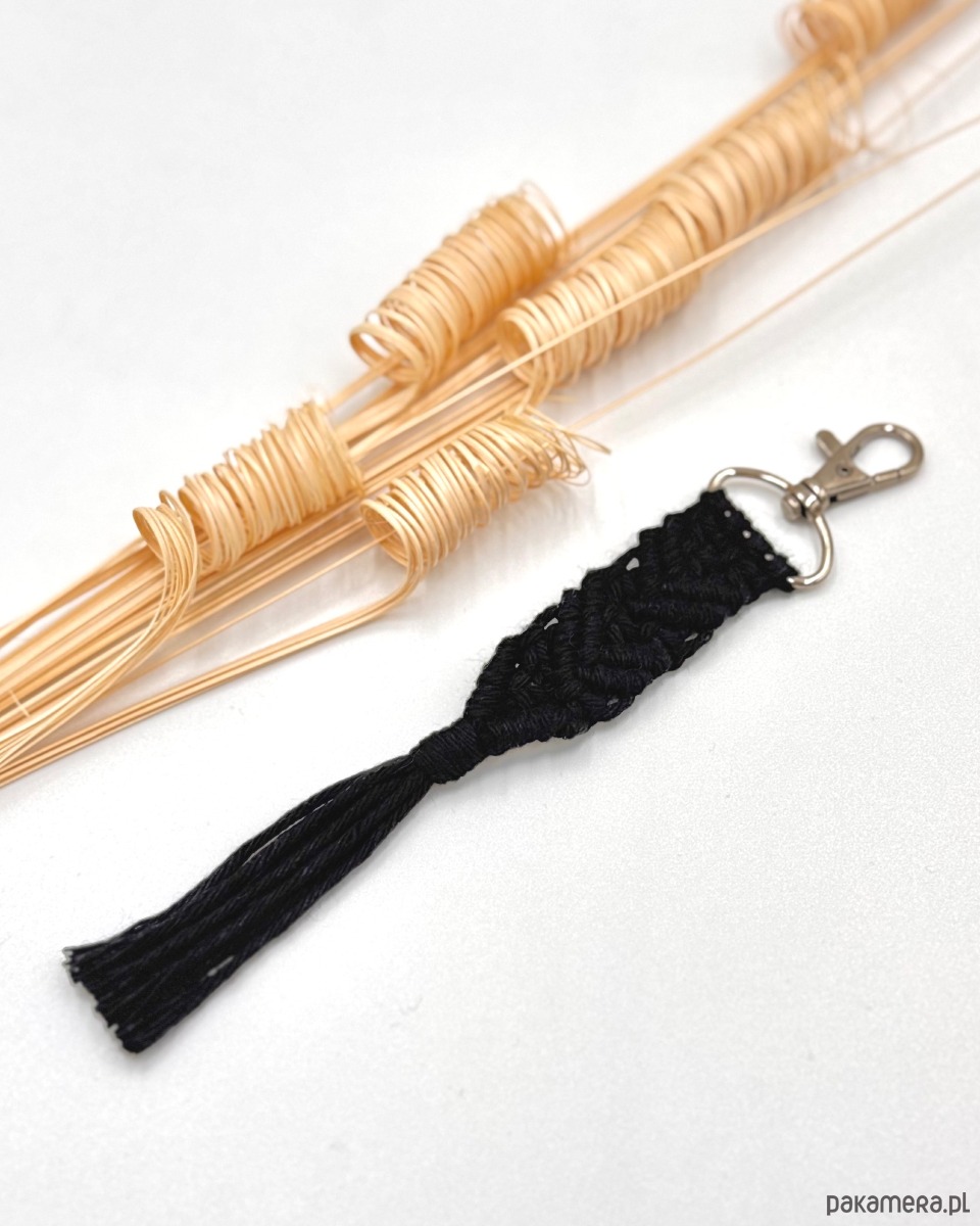 Zawieszka makramowa wykonana z bawełnianego sznurka, umieszczona na praktycznym karabińczyku. Doskonale sprawdzi się jako ozdoba i dodatek do kluczy, portfela lub torebki. Jej subtelny splot w stylu boho doda każdemu przedmiotowi wyjątkowego charakteru.