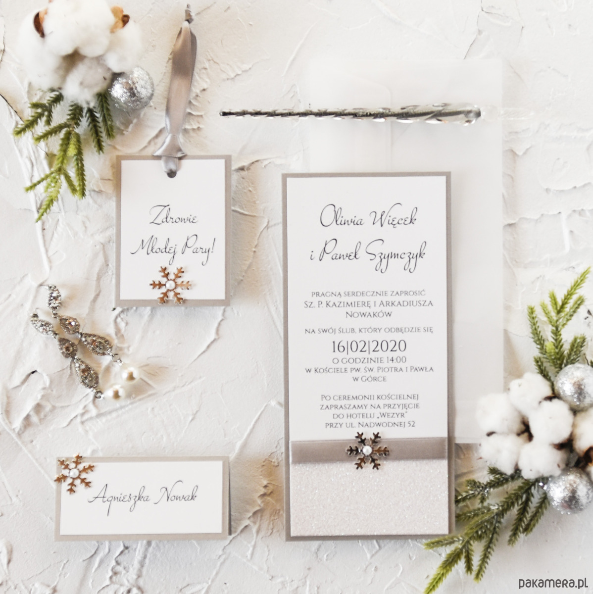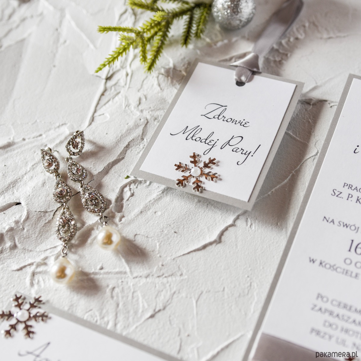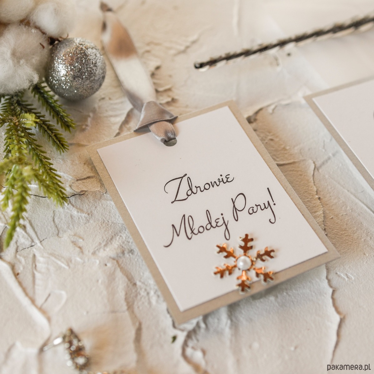 Takie zawieszki idealnie wpiszą się w klimat ślubu i wesela zimową porą:) Nie tylko elegancko ozdobią butelki z weselnymi trunkami, ale jednocześnie będą subtelną dekoracją stołu weselnego. W tej samej kolkcji dopasuję dla Was inne dodatki ślubne np.podziękowania dla gości, winietki, menu czy numery stolików.
