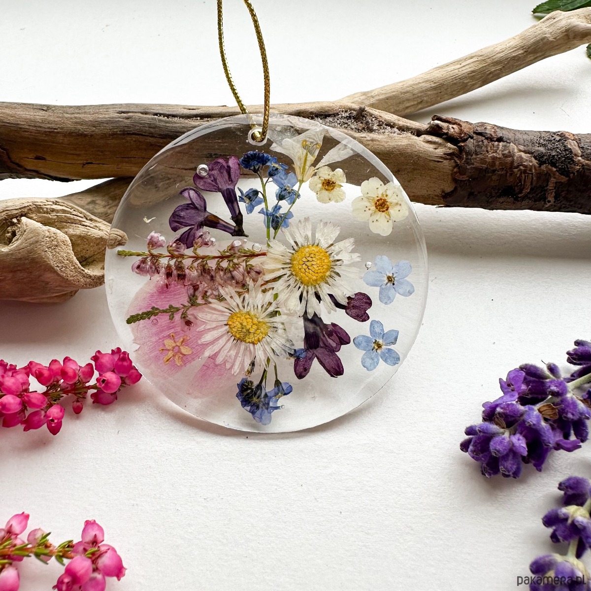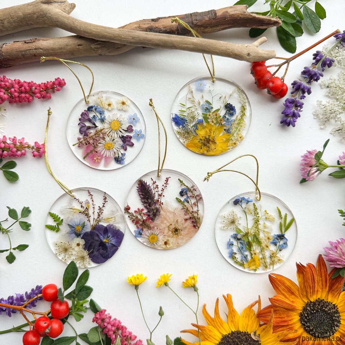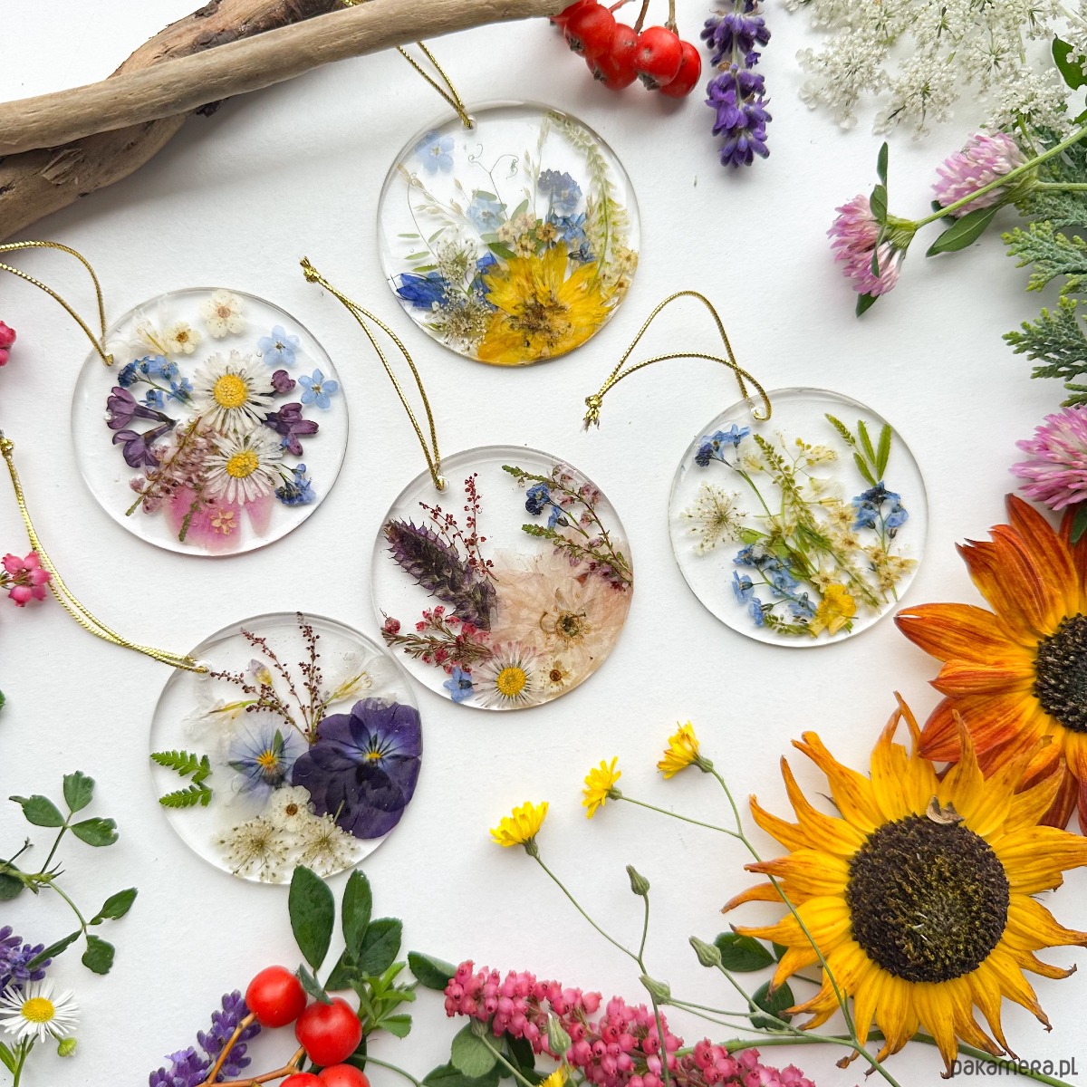 Niepowtarzalne, ręcznie robione bombki z pokrytymi żywicą suszonymi kwiatami. Zestaw zawiera 5 sztuk bombek wykonanych z pleksi (zatem nie da się ich stłuc). To świetny pomysł na niebanalny, wyjątkowy prezent- na życzenie klienta mogę dołączyć karteczkę z dedykacją.