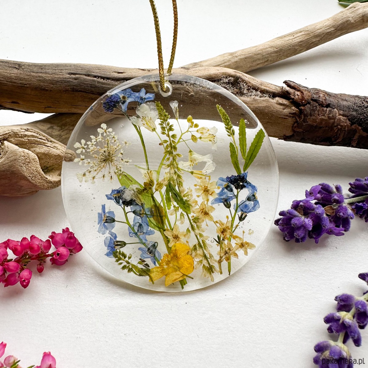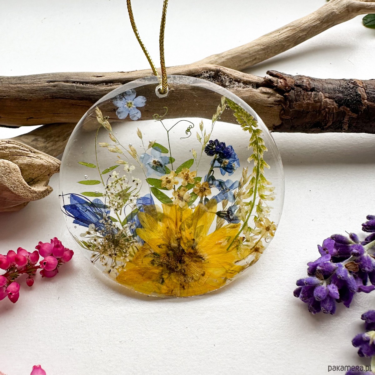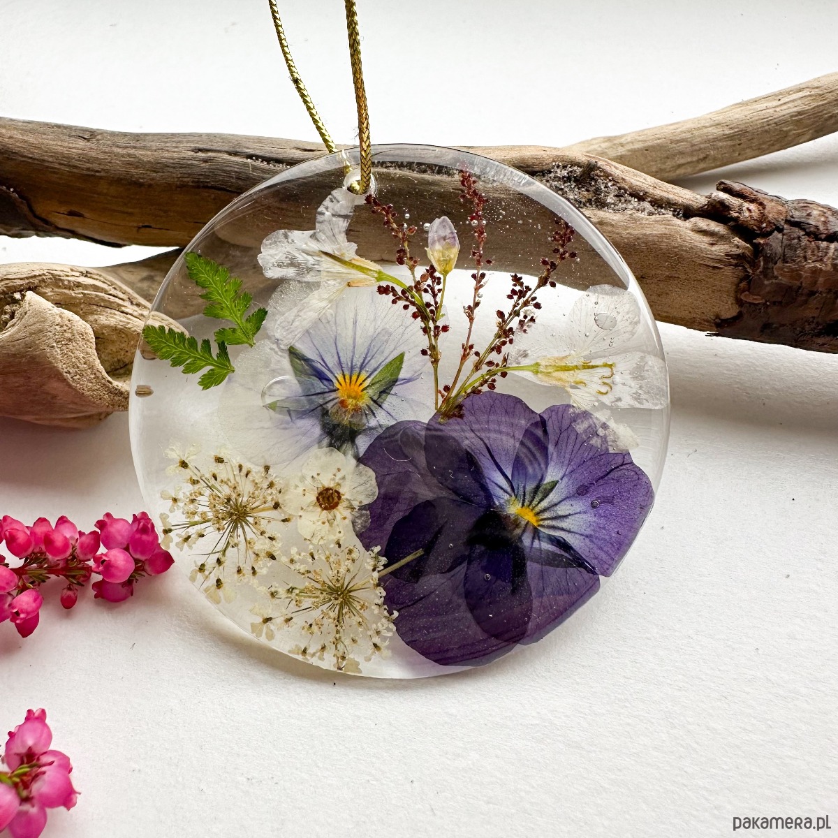 Niepowtarzalne, ręcznie robione bombki z pokrytymi żywicą suszonymi kwiatami. Zestaw zawiera 5 sztuk bombek wykonanych z pleksi (zatem nie da się ich stłuc). To świetny pomysł na niebanalny, wyjątkowy prezent- na życzenie klienta mogę dołączyć karteczkę z dedykacją.