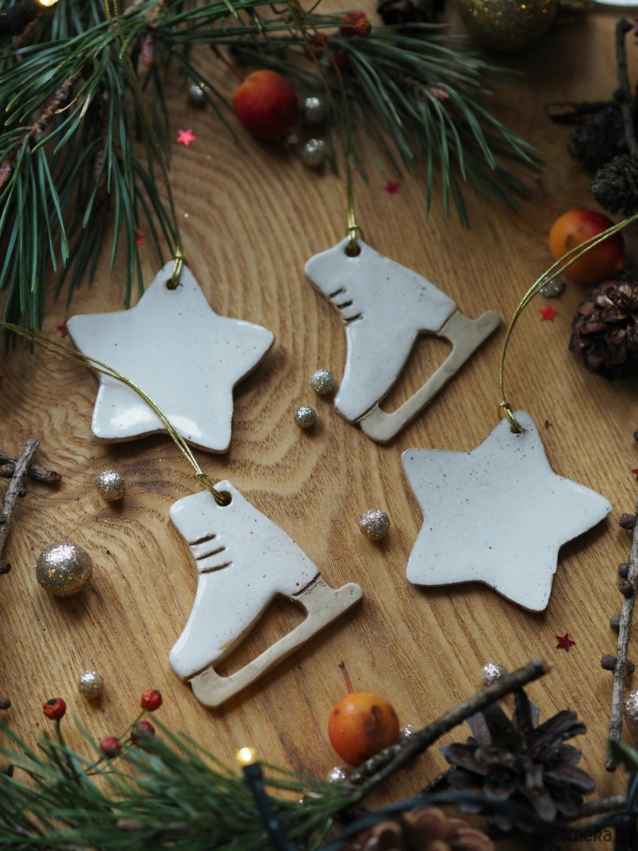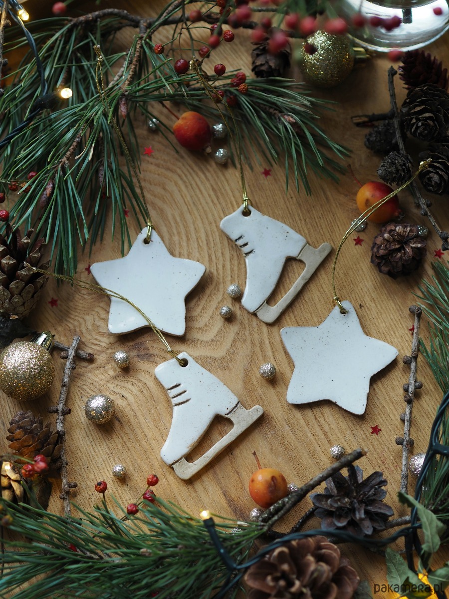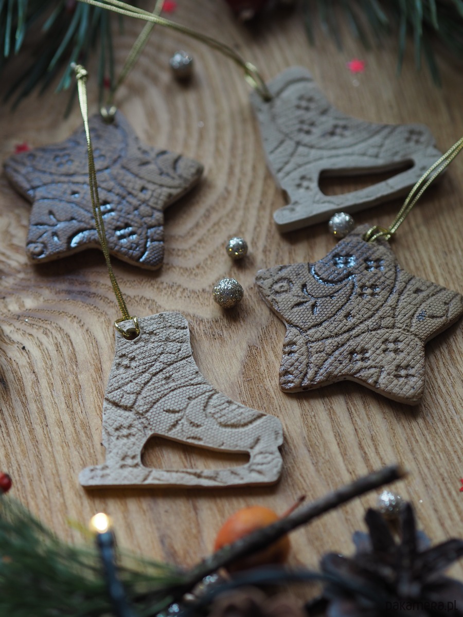 4 zawieszki na choinkę w pudełku 14x14cm. Na jasnej glinie. Z jednej strony szkliwione biało-kremowym szkliwiem w beżowe kropeczki. Od spodu wytłoczona delikatna koronka przetarta glazurą.