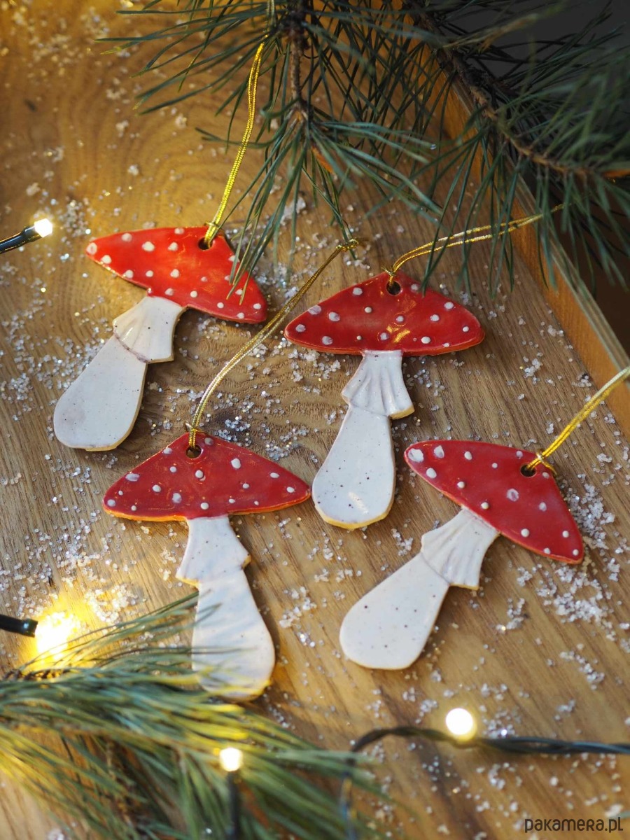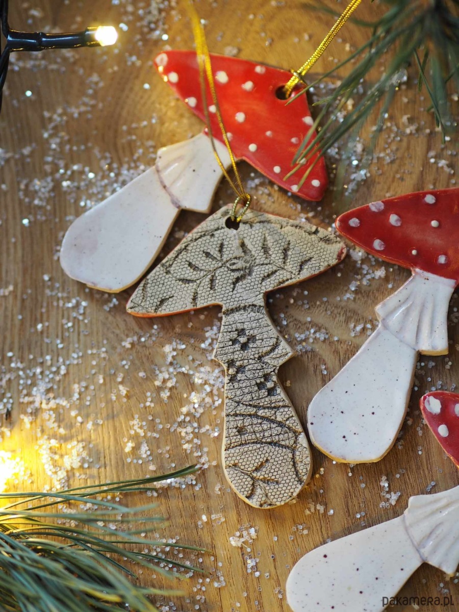 4 zawieszki na choinkę w pudełku 14x14cm. Na jasnej glinie. Z jednej strony szkliwione biało-kremowym szkliwiem w beżowe kropeczki. Od spodu wytłoczona delikatna koronka przetarta glazurą.