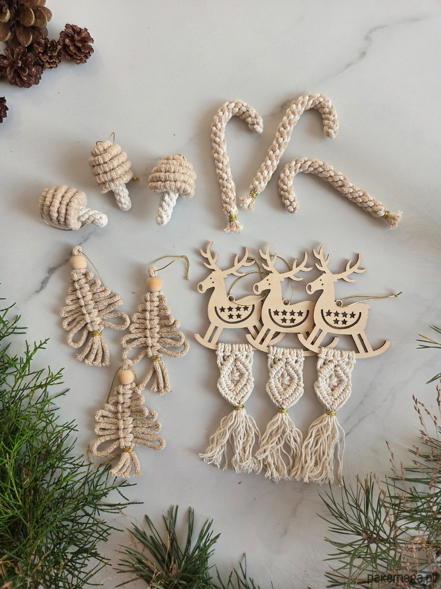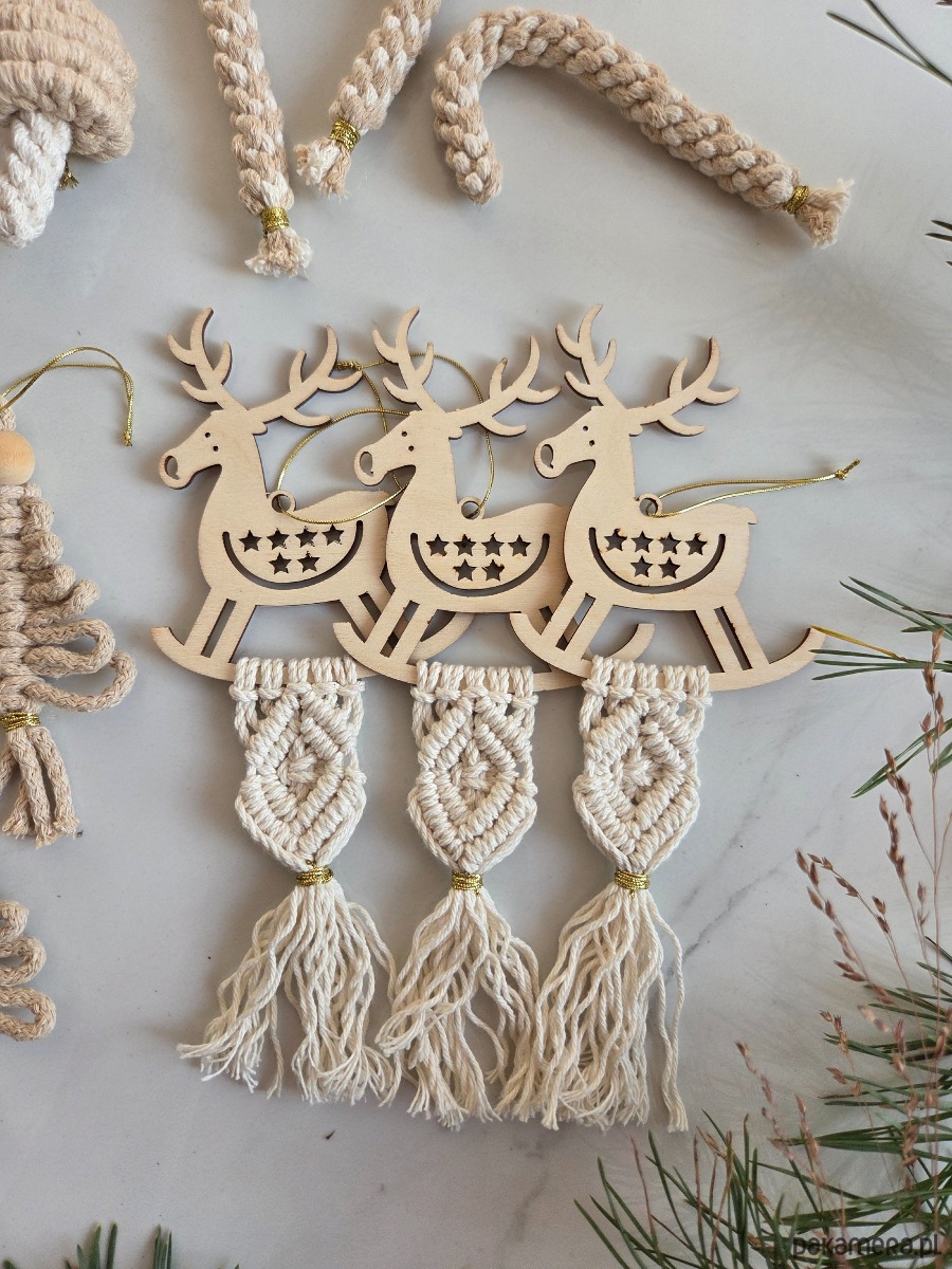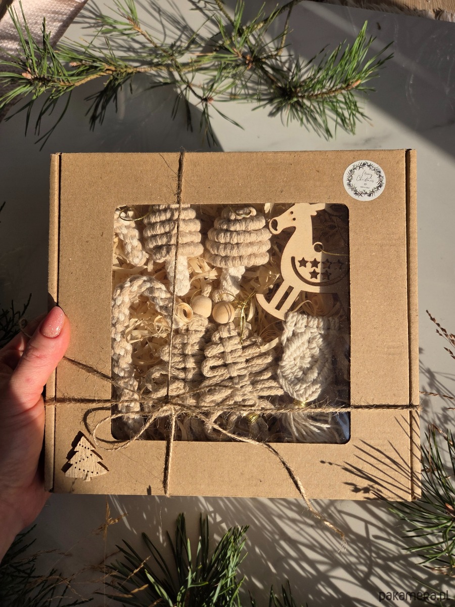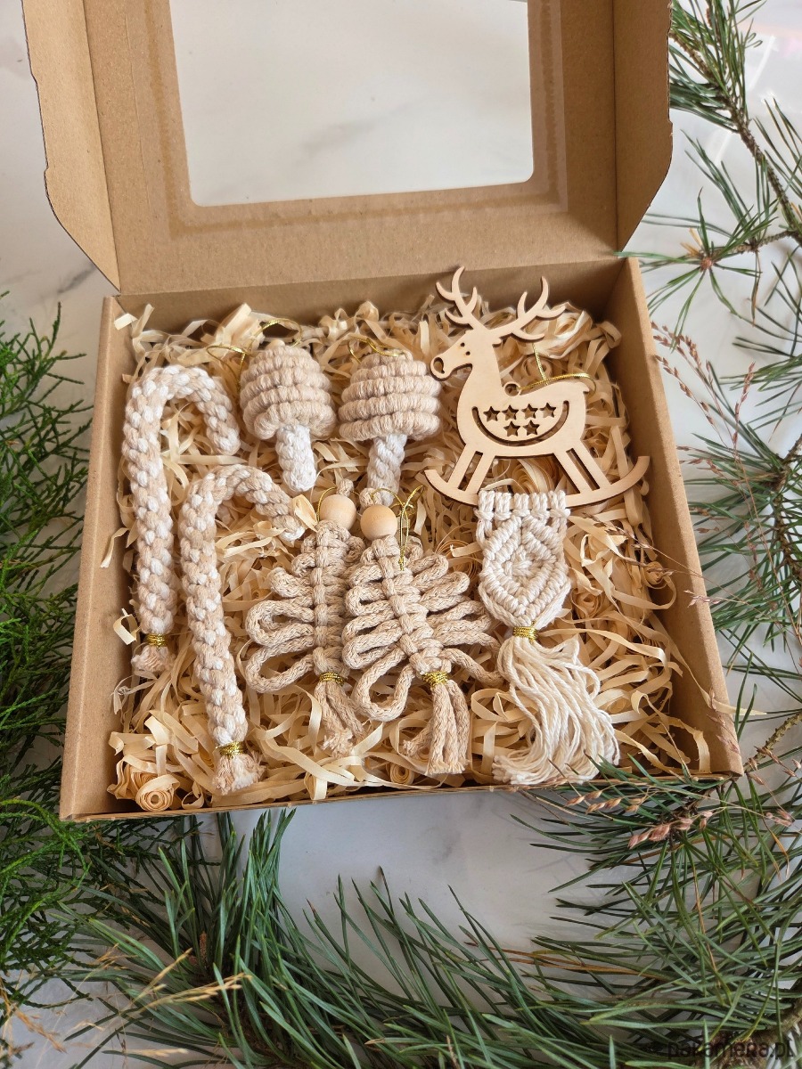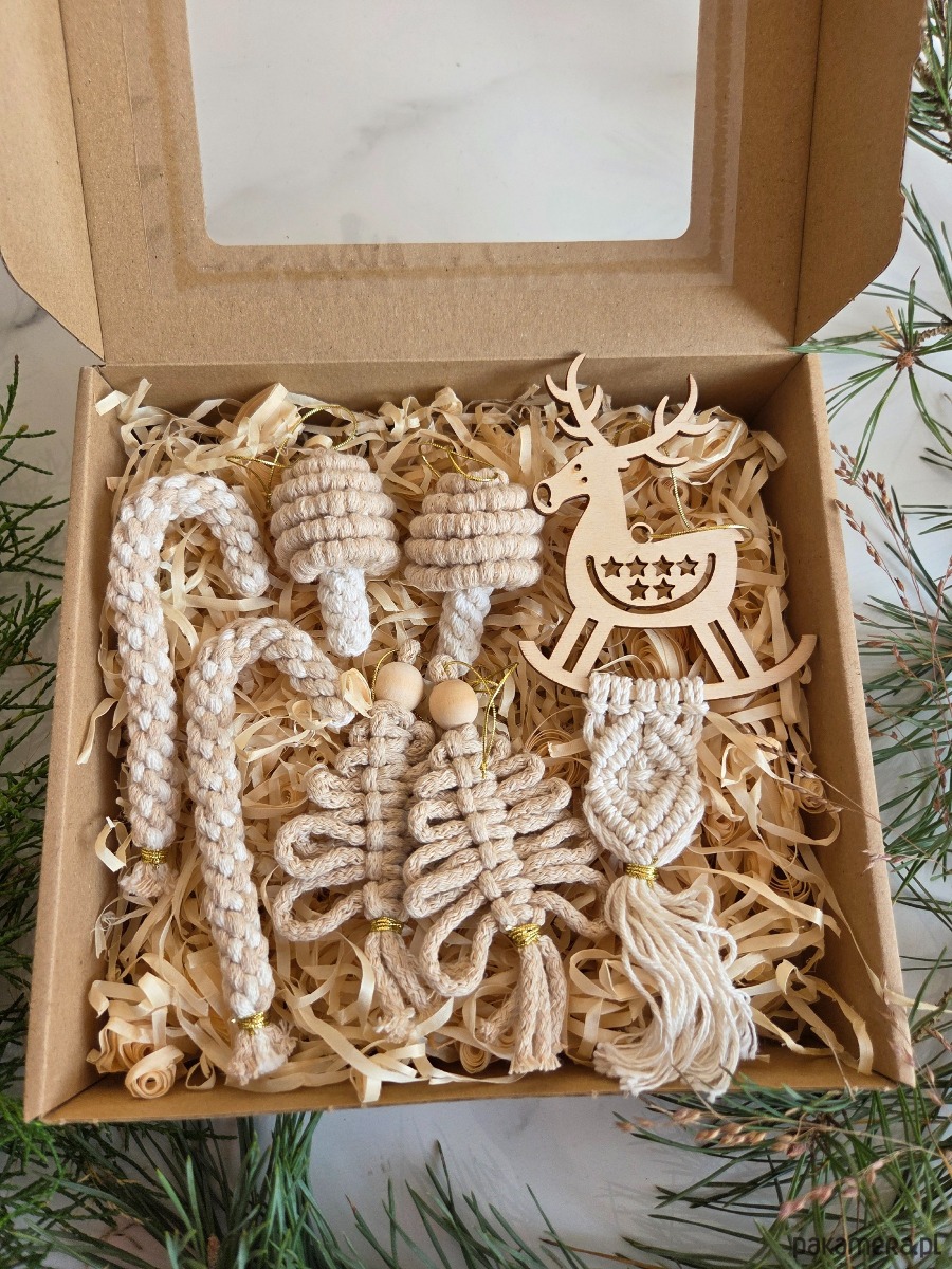 Świąteczny box pełen makramowych zawieszek na choinkę.