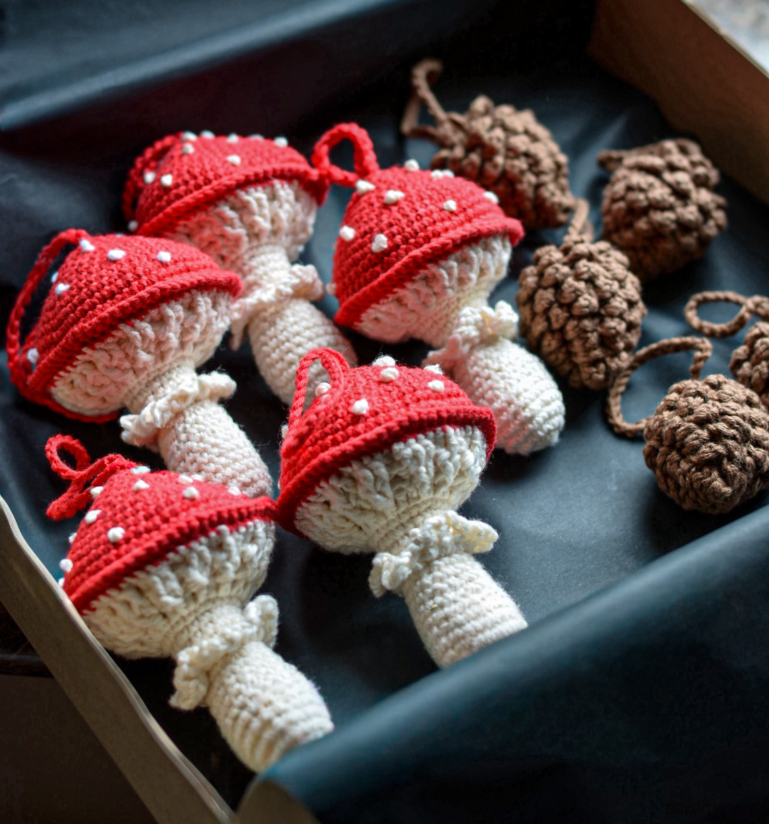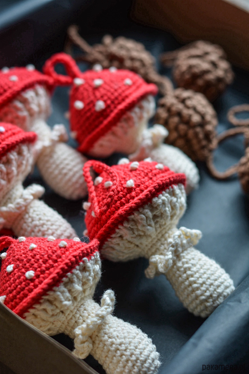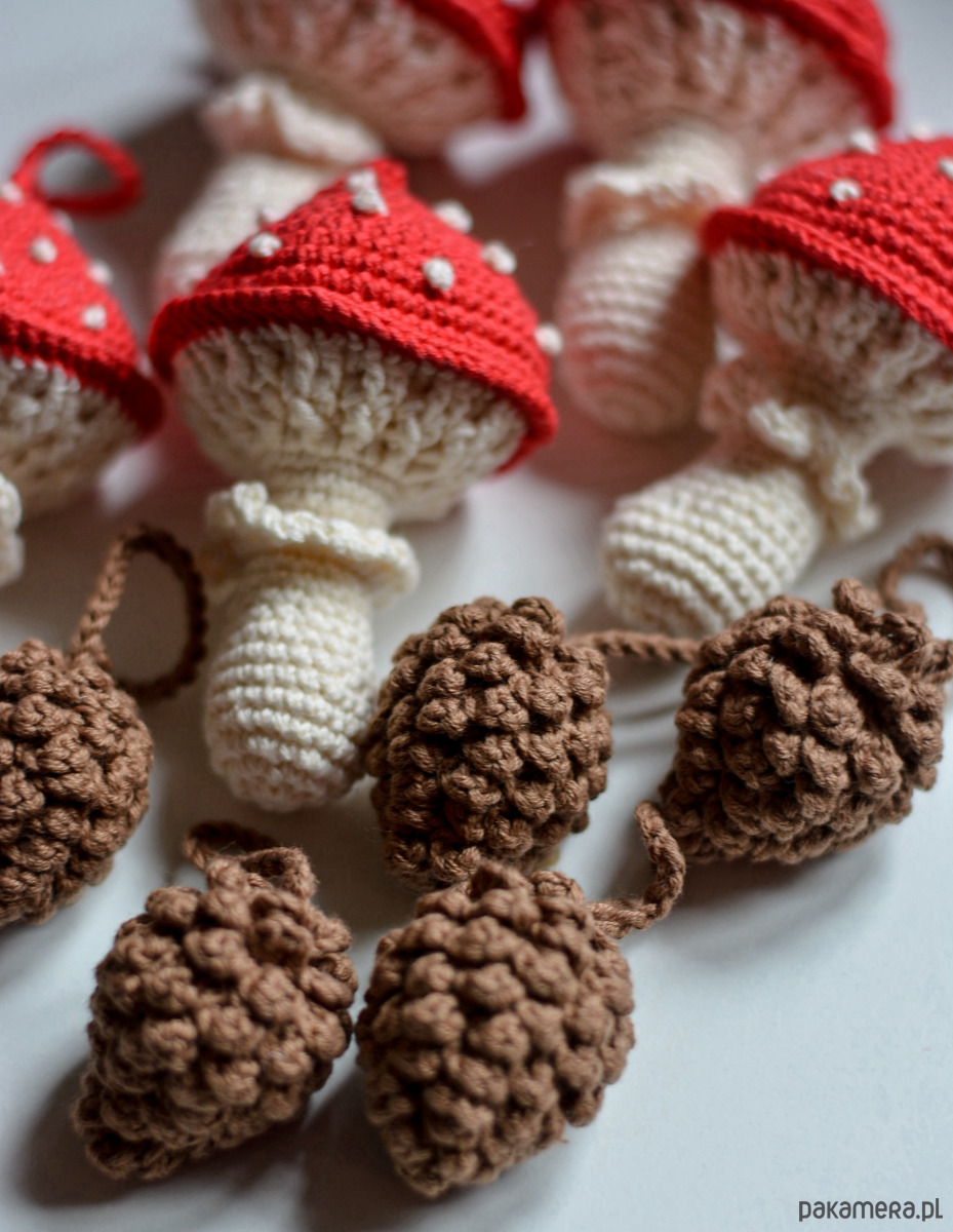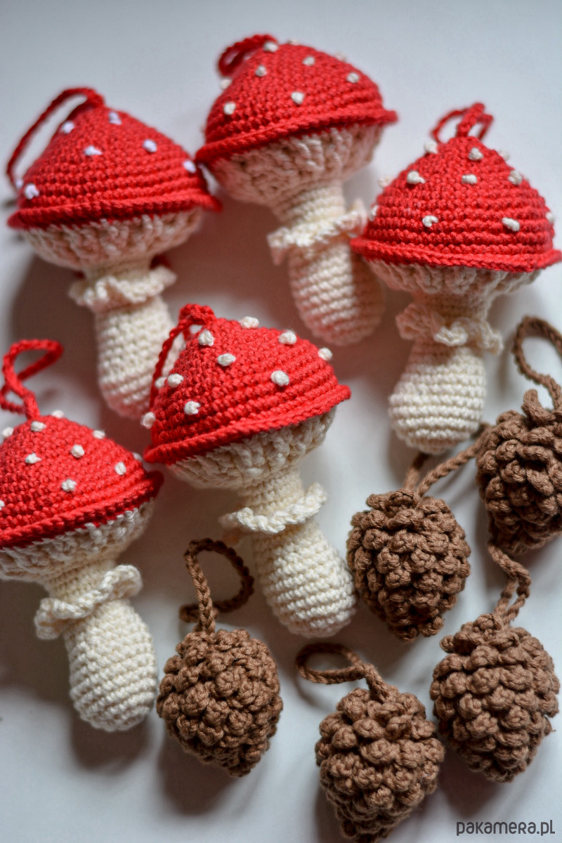 Zestaw składa się z 5 muchomorów ( wysokość ok 10cm, zawieszka 5.5cm) oraz 5 szyszek ( wysokość ok 4.5cm, zawieszka 4.5cm)