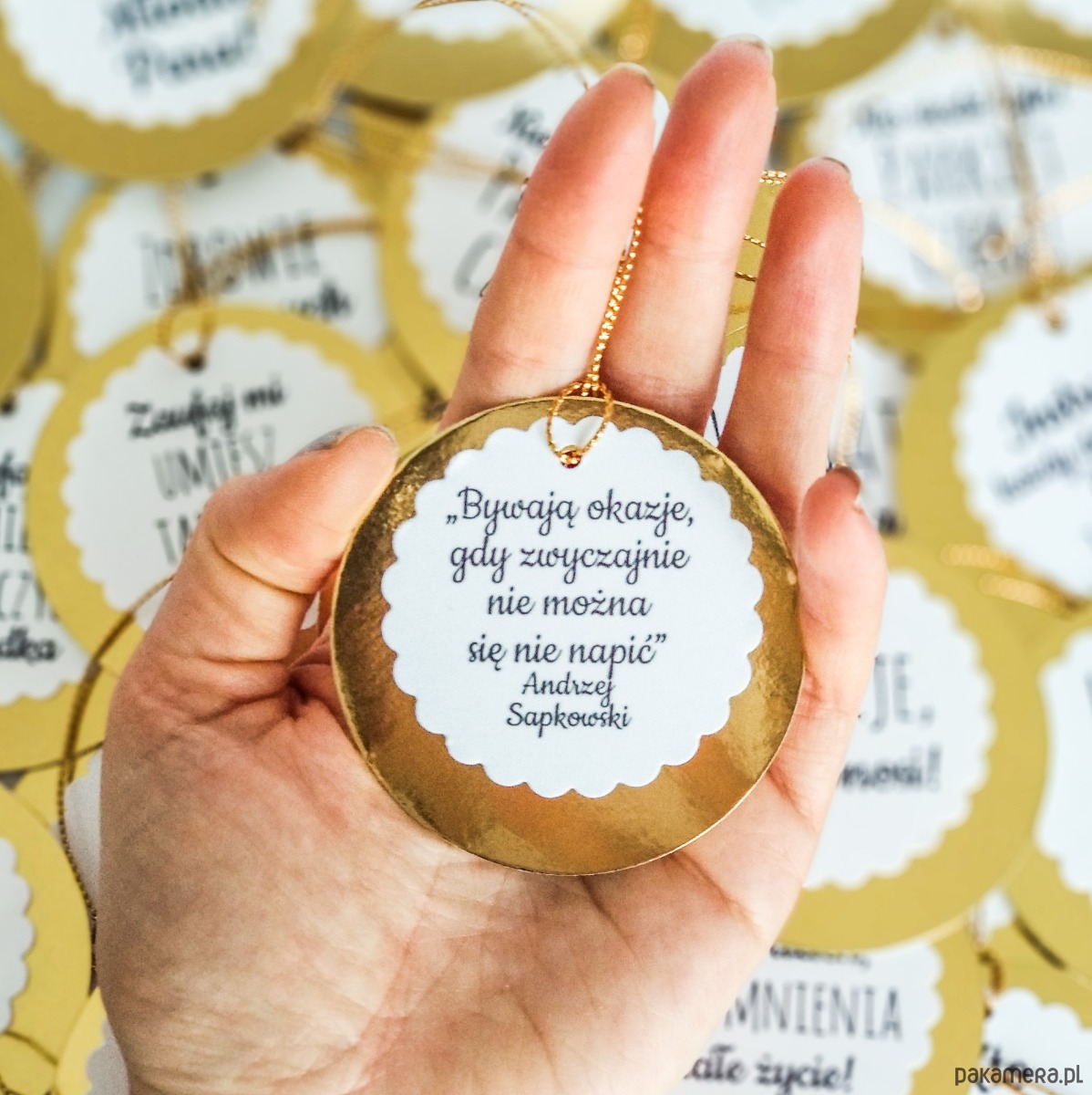 Lśniące złote zawieszki na butelki ze złotymi sznureczkami.