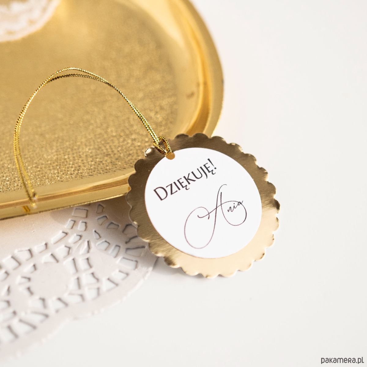 Biało-złote zawieszki z podziękowaniem za przybycie na przyjęcie z okazji Pierwszej Komunii Świętej dziecka.