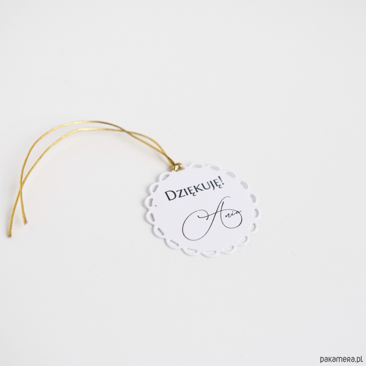 Białe zawieszki z podziękowaniem za przybycie na przyjęcie z okazji Chrztu Świętego dziecka.