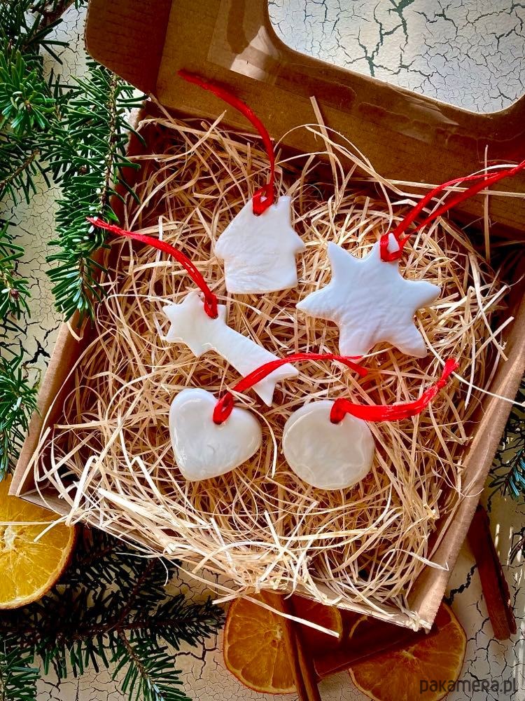 Pięć wyjątkowych, ekskluzywnych zawieszek choinkowych wykonanych z leciutkiej porcelany celulozowej z roślinnym wzorem. Do każdej dołączona satynowa wstążeczka. Całość ułożona na sianku drewnianym, zapakowana w pudełko z okienkiem o wymiarach 20 x 20 cm. Całość idealnie sprawdzi się jako prezent.