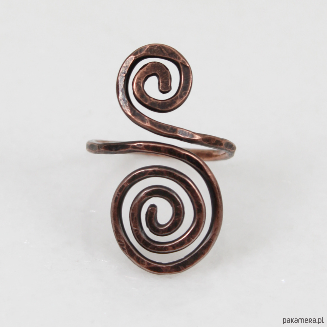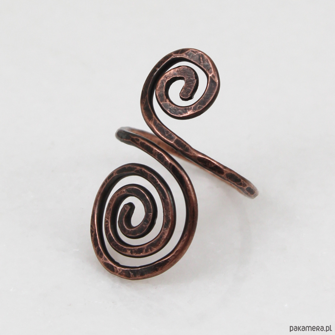 Pierścionek został w całości wykonany z miedzi, jego faktura została lekko podkreślona ciemną patyną uzyskaną w procesie oksydacji (bez użycia barwników).